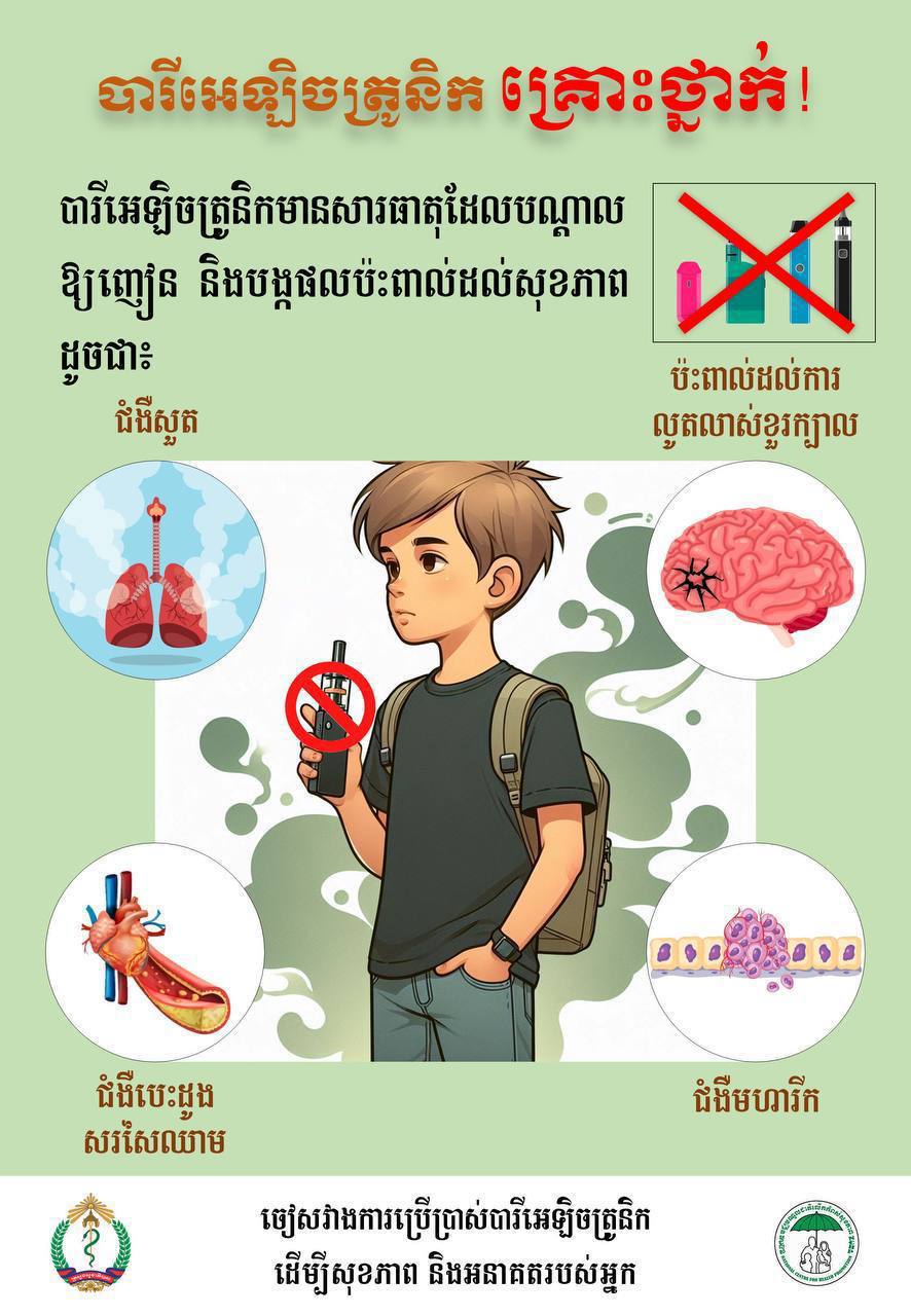 ក្រសួងសុខាភិបាល នៃព្រះរាជាណាចក្រ​កម្ពុជា កាលពីសប្តាហ៍​កន្លងទៅនេះ បានធ្វើ​ការ​ក្រើន​រំលឹក​ជា​ថ្មី​ទៅ​សាធារណជន ជាពិសេសយុវជន អំពីផលប៉ះពាល់​ដែល​បង្ក​ឡើង​ដោយ​ការ​ប្រើប្រាស់បារីអេឡិចត្រូនិក។