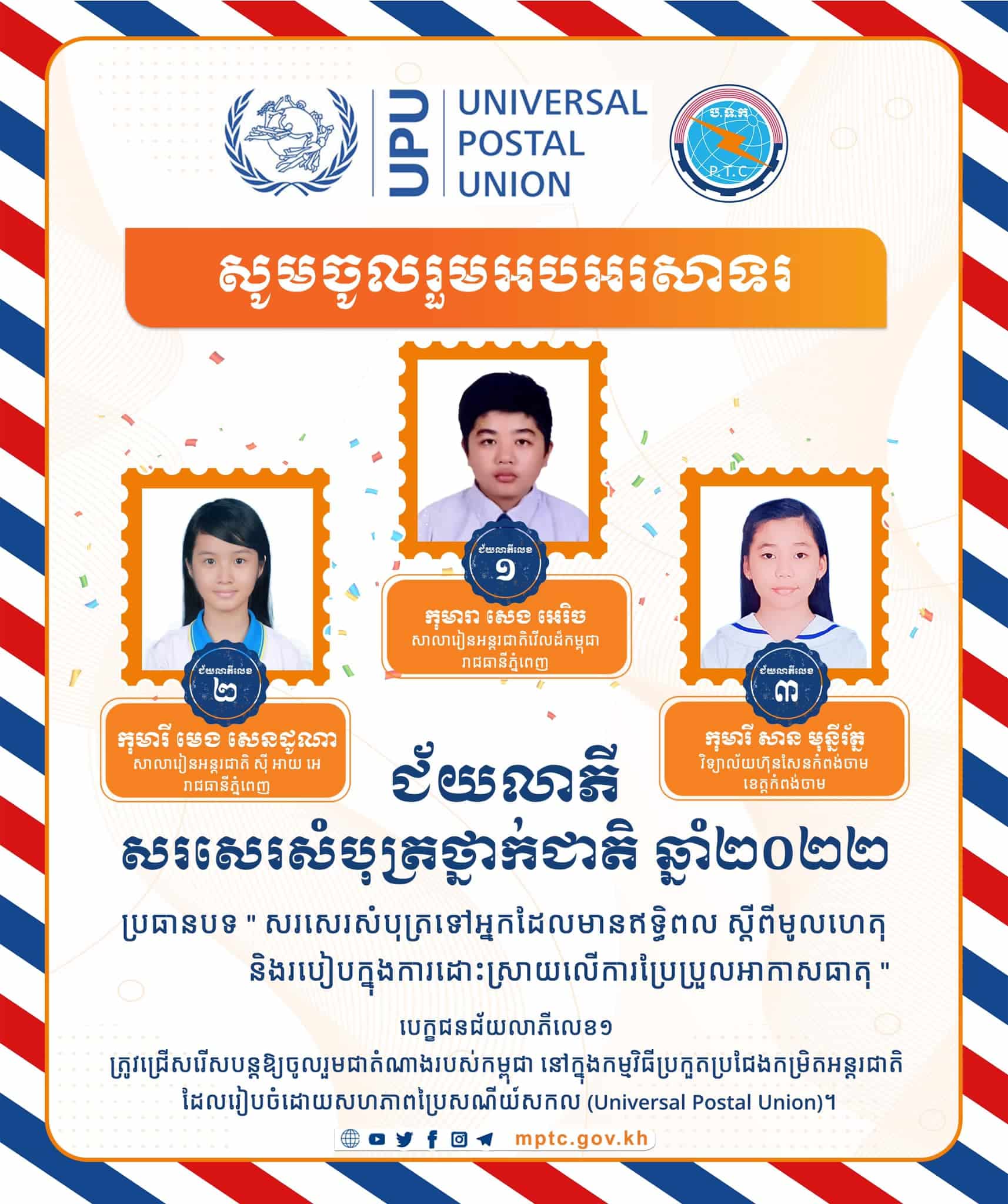 ភ្នំពេញ – ក្រសួងប្រៃសណីយ៍និងទូរគមនាគមន៍ បានប្រកាសកុមារា និងកុមារីចំនួន ០៣រូបជាប់ជ័យលាភីការប្រកួតប្រជែងក្នុងកម្មវិធីសរសេរសំបុត្រថ្នាក់ជាតិលើកទី១ ឆ្នាំ២០២២ លើប្រធានបទ “ សរសេរសំបុត្រទៅអ្នកដែលមានឥទ្ធិពល ស្តីពីមូលហេតុនិងរបៀបដោះស្រាយការប្រែប្រួលអាកាសធាតុ” កាលពីថ្ងៃអាទិត្យម្សិលមិញ ។
