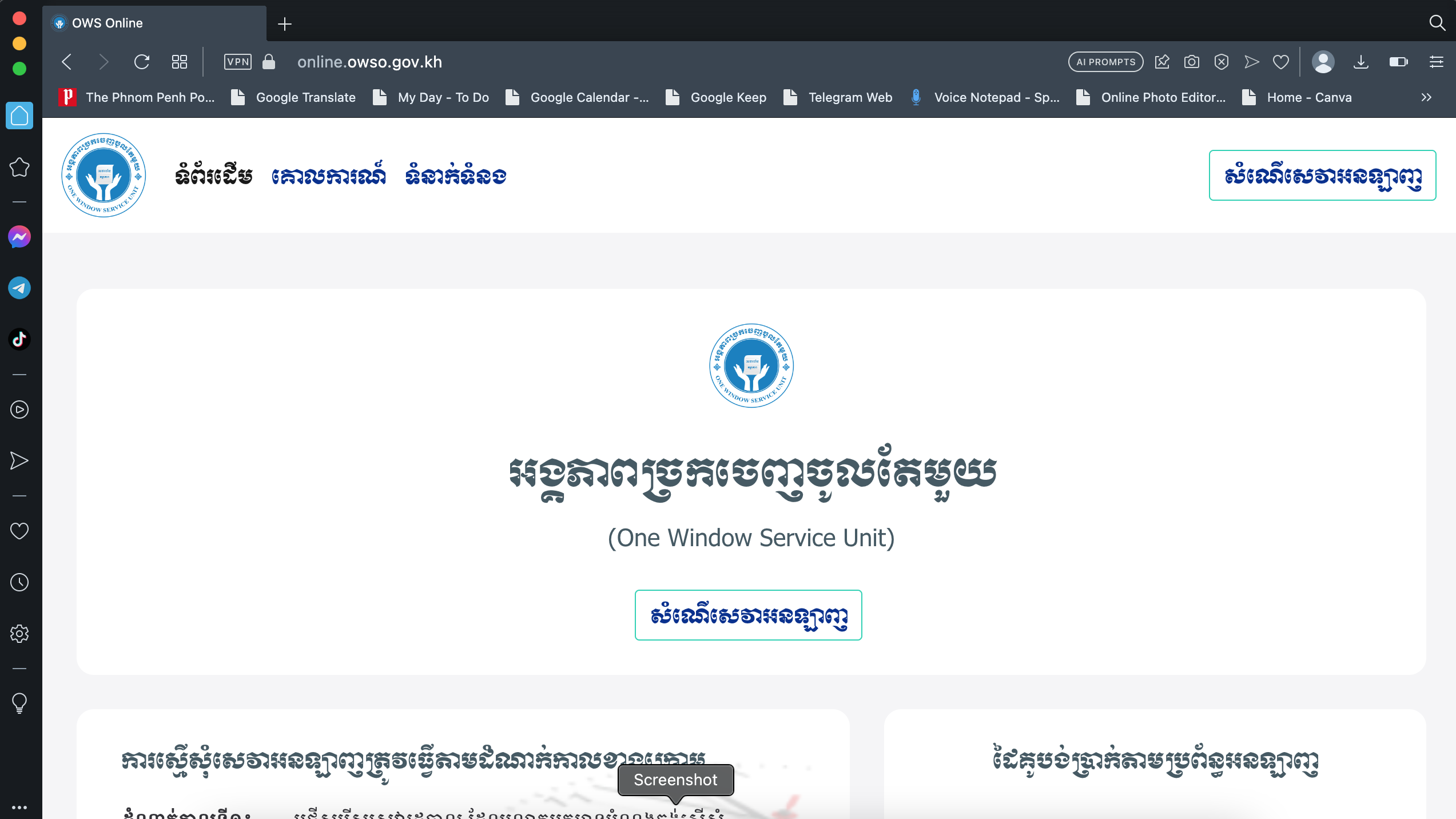 សម្រាប់បងប្អូនប្រជាពលរដ្ឋដែលមានបំណងចង់ដាក់ពាក្យស្នើសុំសេវារដ្ឋបាលតាមប្រព័ន្ធអនឡាញ (online) សូមចូលទៅកាន់គេហទំព័រ http://online.owso.gov.kh/ ដើម្បីបង្កើតគណនីសម្រាប់ស្នើសុំសេវារដ្ឋបាលទាំង៤វិស័យខាងលើ ដោយភ្ជាប់ឯកសារពាក់ព័ន្ធតាមការណែនាំក្នុងជំហាននីមួយៗ។