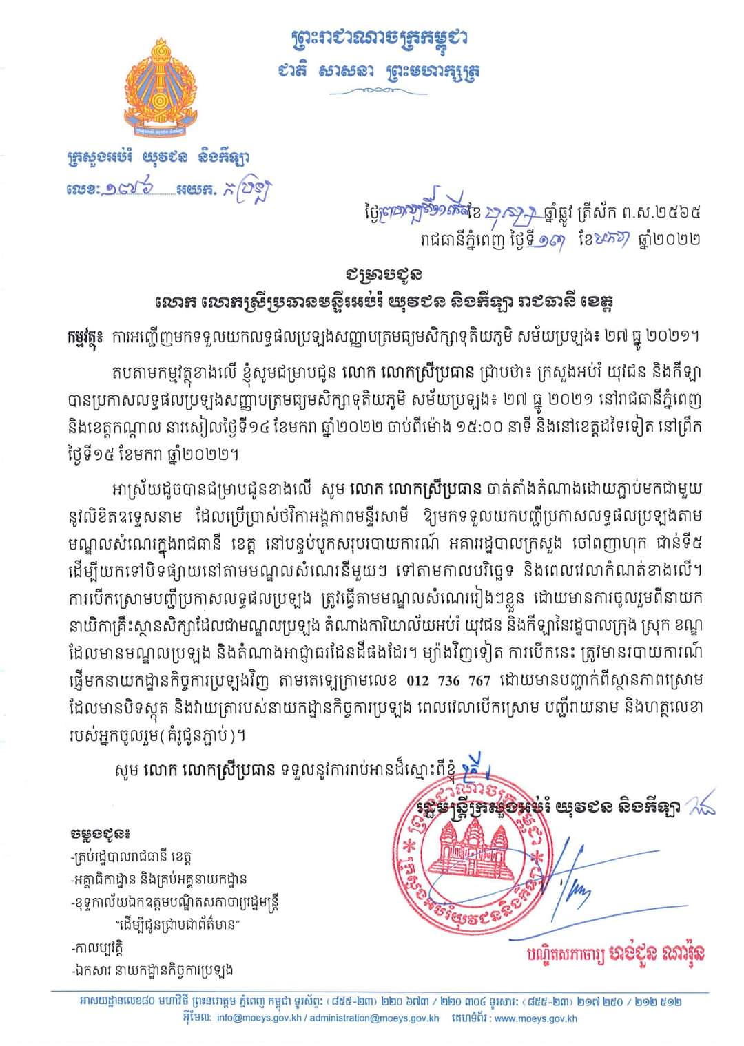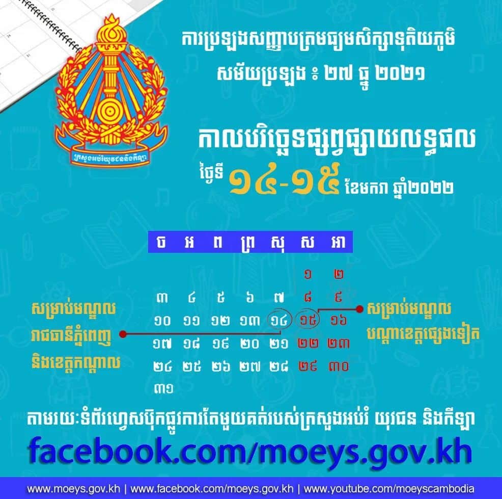 ភ្នំពេញ ៖ ក្រសួងអប់រំ យុវជន និងកីឡា នឹងប្រកាសលទ្ធផលប្រឡងសញ្ញាបត្រមធ្យមសិក្សាទុតិយភូមិ សម័យប្រឡង ២៧ ធ្នូ ២០២១ នៅរសៀលថ្ងៃទី១៤ ខែមករា ឆ្នាំ២០២២ សម្រាប់រាជធានីភ្នំពេញ និងខេត្តកណ្ដាល និងថ្ងៃទី១៥ ខែមករា ឆ្នាំ២០២២ សម្រាប់ខេត្តផ្សេងៗទៀត ។ ការប្រកាសលទ្ធផលនឹងធ្វើឡើងតាមរយៈទំព័រហ្វេសប៊ុកផ្លូវការក្រសួងអប់រំ Facebook.com/moeys.gov.kh ព្រមទាំងបិទផ្សាយតាមមណ្ឌលសំណេរនីមួយៗ។