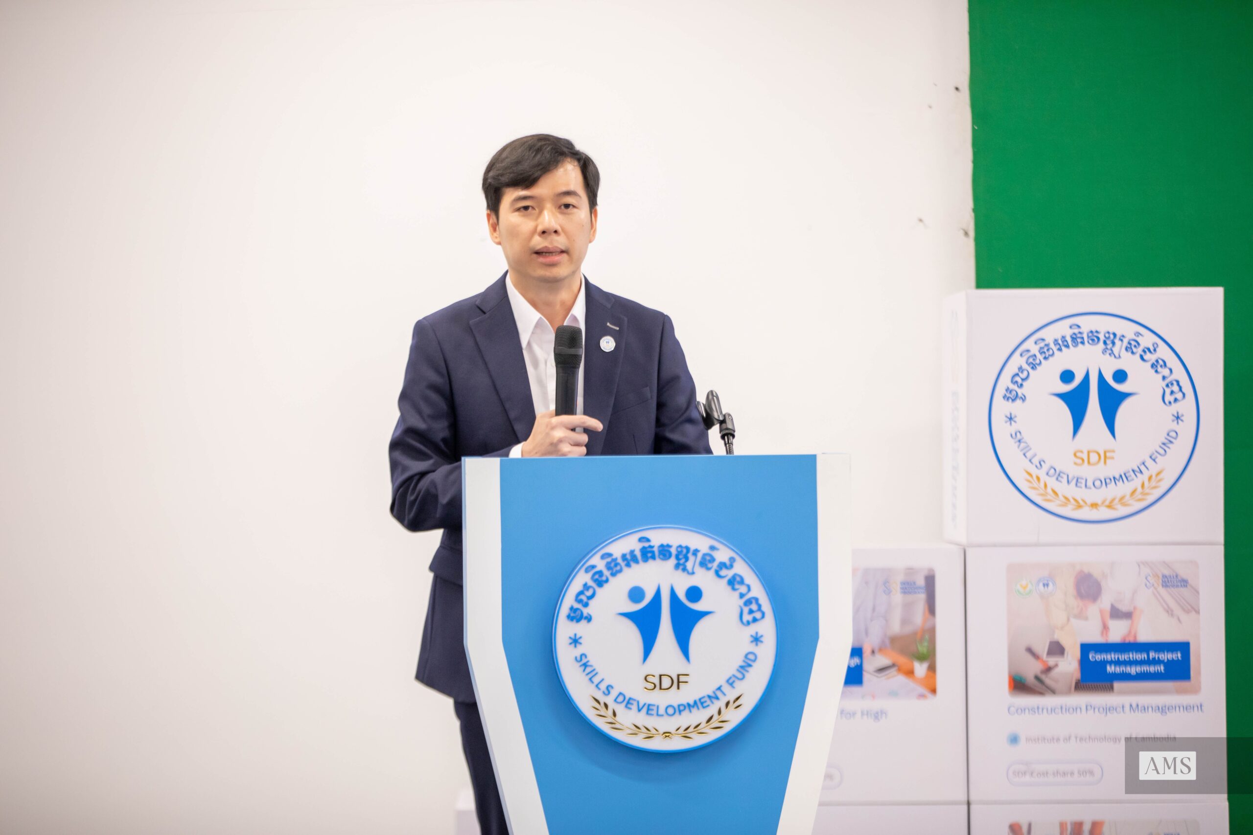 លោក គី សុខគីម នាយកប្រតិបត្តិ មូលនិធិអភិវឌ្ឍន៍ជំនាញ (SDF) អំឡុងពេលថ្លែងសន្ទរកថា បើកកម្មវិធី។