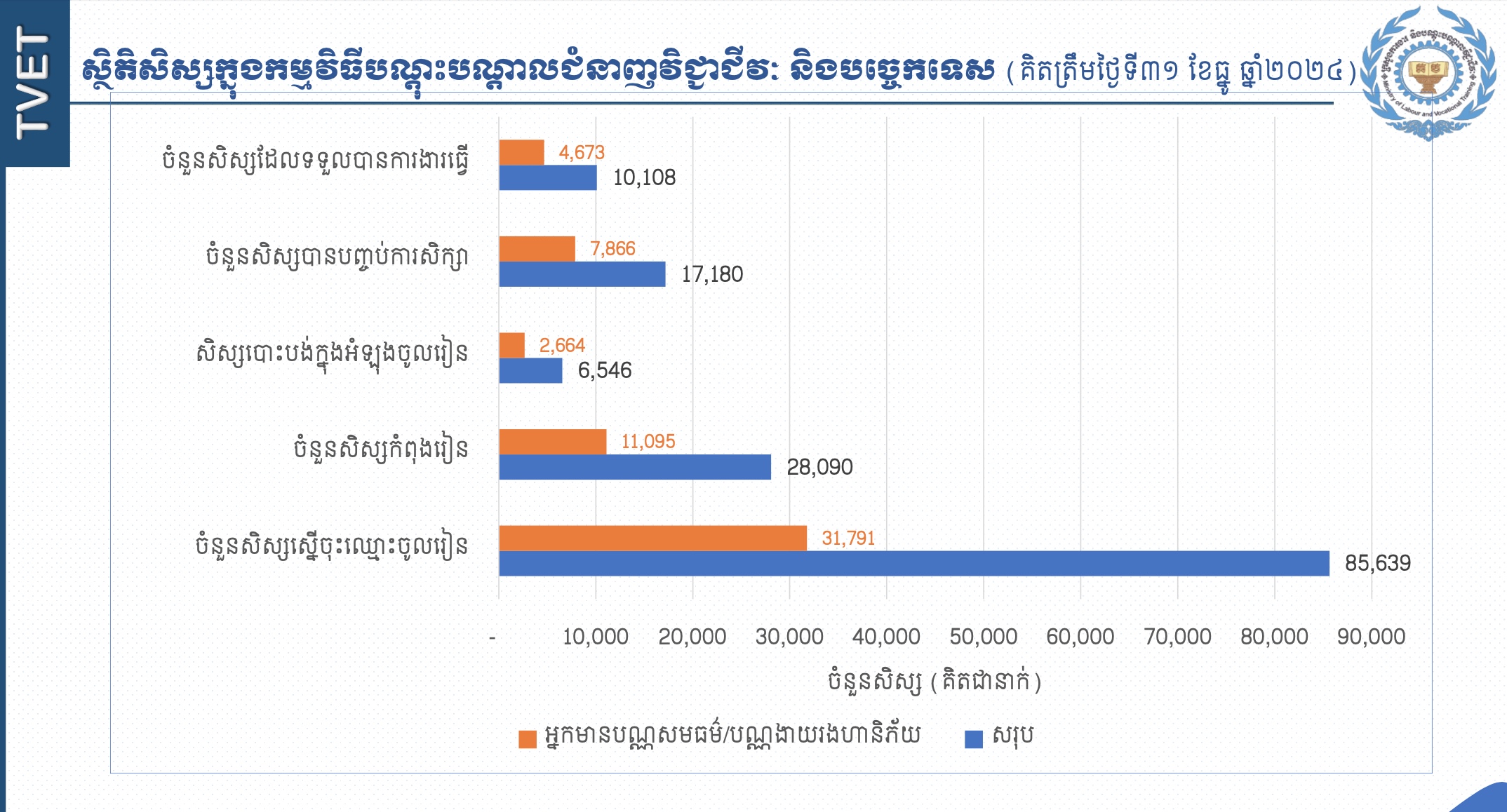 យោងតាមរបាយការណ៍របស់អគ្គនាយកអប់រំបណ្តុះបណ្តាលបច្ចេកទេស និងវិជ្ជាជីវៈ កម្មវិធីបណ្តុះបណ្តាលជំនាញវិជ្ជាជីវៈ និងបច្ចេកទេស ១,៥លាននាក់ ដែលរាជរដ្ឋាភិបាលបានប្រកាសដាក់ឱ្យអនុវត្តកាលពីចុងឆ្នាំ២០២៣ ទទួលបានការគាំទ្រពីគ្រប់មជ្ឈដ្ឋាន ប៉ុន្តែចំនួនសិស្សចុះឈ្មោះចូលរៀននៅមិនទាន់មានចំនួនច្រើននៅឡើយ។ បើតាមតួលេខ ក្នុងឆ្នាំ២០២៤ សិស្សដែលបានចុះឈ្មោះចូលរៀនក្នុងកម្មវិធីបណ្តុះបណ្តាលជំនាញ ១,៥លាននាក់ មានសរុបចំនួន ៨៥ ៦៣៩នាក់ ក្នុងនោះសិស្សដែលបញ្ចប់ការសិក្សាមានចំនួន ១៧ ១៨០នាក់, កំពុងសិក្សាមានចំនួន ២៨ ០៩០នាក់, ទទួលបានការងារធ្វើ ១០ ១០៨នាក់ ហើយក៏មានសិស្សបោះបង់ចំនួន ៦៥៤៦នាក់។