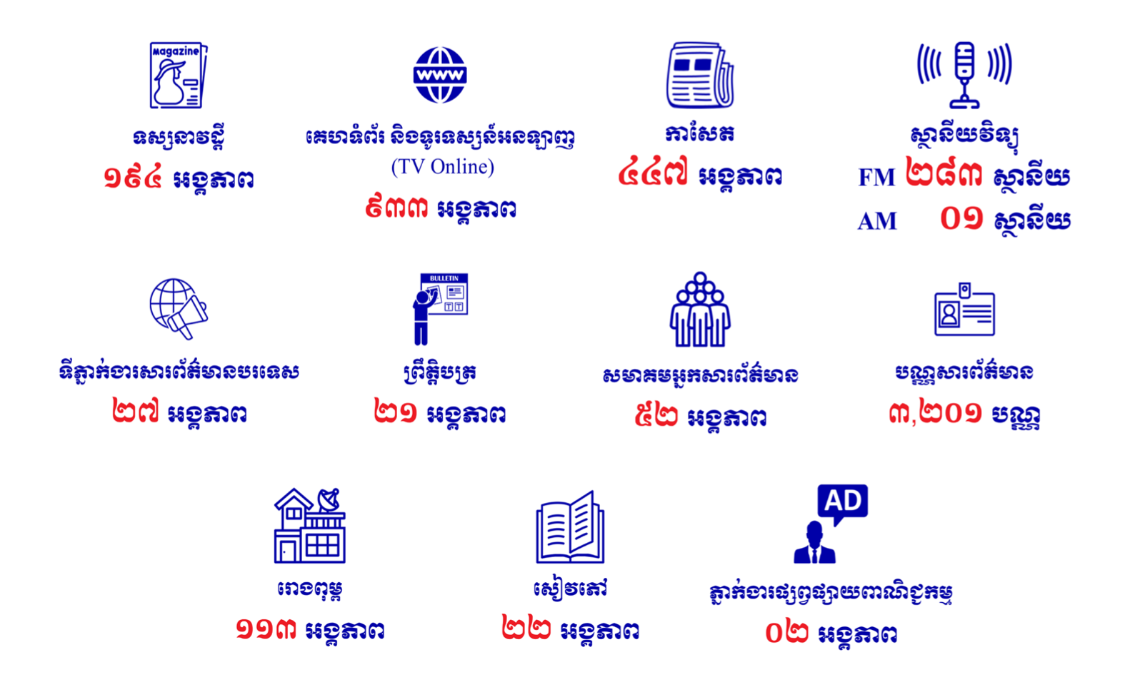 ផ្អែកតាមទិន្នន័យបច្ចុប្បន្នភាពឆ្នាំ២០២៣របស់ក្រសួងព័ត៌មានបង្ហាញថា បច្ចុប្បន្នប្រព័ន្ធផ្សព្វផ្សាយទាំងប្រពៃណី និងទំនើប ដែលបានចុះបញ្ជិកានៅក្រសួងព័ត៌មាន មានចំនួនជាង២ពាន់ រួមមាន គេហទំព័រ និងទូរទស្សន៍អនឡាញមានចំនួន ៩៣៣អង្គភាព, កាសែត ៤៤៧អង្គភាព, សមាគមសារព័ត៌មាន ៥២អង្គភាព, ទស្សនាវដ្តី ១៩៤អង្គភាព, ព្រឹត្តិបត្រ ២១អង្គភាព, ស្ថានីយវិទ្យូ ២៨៤ស្ថានីយ, ទីភ្នាក់ងារសារព័ត៌មានបរទេស ២៧អង្គភាព, ទូរទស្សន៍ផ្សាយផ្ទាល់ ១៩ស្ថានីយ និងផ្សាយបន្ត ១៦៥ស្ថានីយ, ទូរទស្សន៍ឌីជីថល ១២ស្ថានីយ, ទូរទស្សន៍ខ្សែកាបរាជធានីភ្នំពេញ និងនៅតាមខេត្ត៤៤ស្ថានីយ៍ និងទូរទស្សន៍អាណាឡូកមានចំនួន ១៤៣ស្ថានីយ ខណៈអ្នកសារព័ត៌មានមានចំនួនប្រមាណ មួយម៉ឺននាក់៕