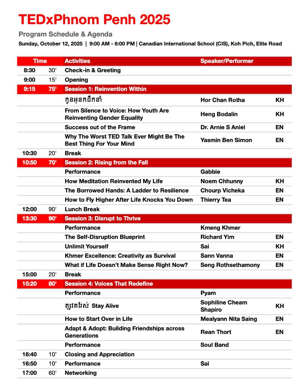ភ្នំពេញ, កម្ពុជា — កម្មវិធី TEDxPhnom Penh បានត្រឡប់មកវិញនៅឆ្នាំនេះ ជាមួយបទពិសោធន៍ពេញមួយថ្ងៃ ក្រោមមូលបទ “ភាពធន់ និងការបង្កើតឡើងវិញ”។ កម្មវិធីនេះនឹងប្រារព្ធឡើងនៅថ្ងៃអាទិត្យ ទី១២ ខែតុលា ឆ្នាំ២០២៥ ចាប់ពីម៉ោង ៩ ព្រឹក ដល់ ៦ ល្ងាច នៅ សាលាអន្តរជាតិកាណាដា (CIS) កោះពេជ្រ ដោយប្រមូលផ្ដុំអ្នកជំនាញ ស្ថាបនិក និងវាគ្មិនដ៏លេចធ្លោប្រចាំប្រទេសកម្ពុជា។