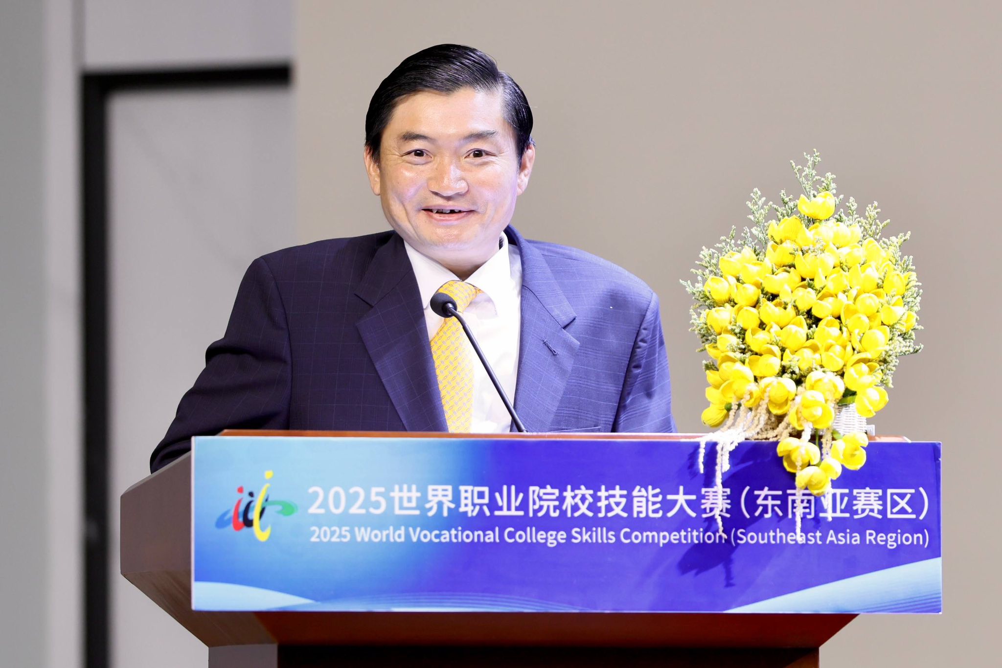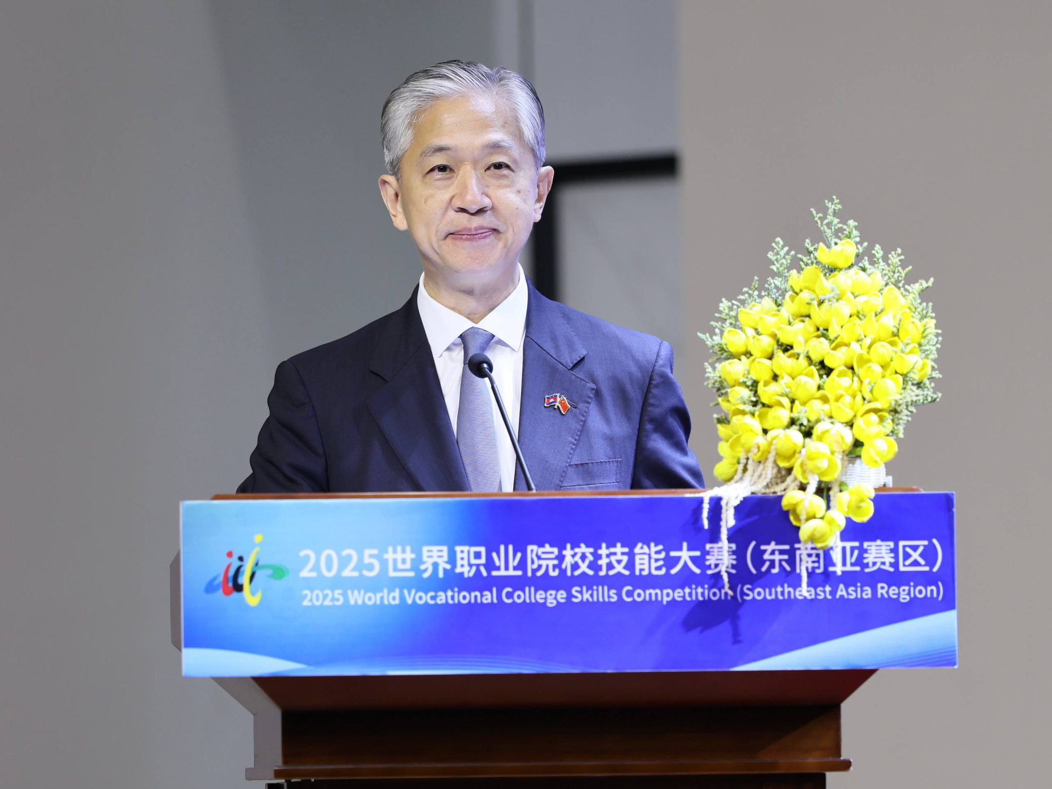 ឯកឧត្តមឯកអគ្គរដ្ឋទូតបញ្ជាក់ថា រដ្ឋាភិបាលចិនយកចិត្តទុកដាក់យ៉ាងខ្លាំងក្នុងការជំរុញអភិវឌ្ឍន៍ជំនាញវិជ្ជាជីវៈ ដោយបាននិងកំពុងពង្រឹង និងពង្រីកកិច្ចសហប្រតិបត្តិការជាមួយបណ្តាប្រទេសជាច្រើនទូទាំងពិភពលោក តាមរយៈការរៀបចំការប្រកួតប្រជែងជាលក្ខណៈអន្តរជាតិយ៉ាងសម្បូរបែប ដែលក្នុងនេះរួមមាន «ការប្រកួតប្រជែងសមត្ថភាពជំនាញមហាវិទ្យាល័យវិជ្ជាជីវៈពិភពលោកឆ្នាំ២០២៥ ប្រចាំតំបន់អាស៊ាន» ដែលស្តែងឱ្យឃើញពីលទ្ធផលនៃកិច្ចសហប្រតិបត្តិការប្រកបដោយផ្លែផ្ការរវាងកម្ពុជា-ចិន លើវិសល័យអភិវឌ្ឍន៍ការបណ្តុះបណ្តាលជំនាញវិជ្ជាជីវៈ ដោយបានទាក់ទាញសិស្សនិស្សិតជាច្រើនមកពីបណ្តាប្រទេសក្នុងតំបន់ចូលរួមប្រកួតប្រជែង។