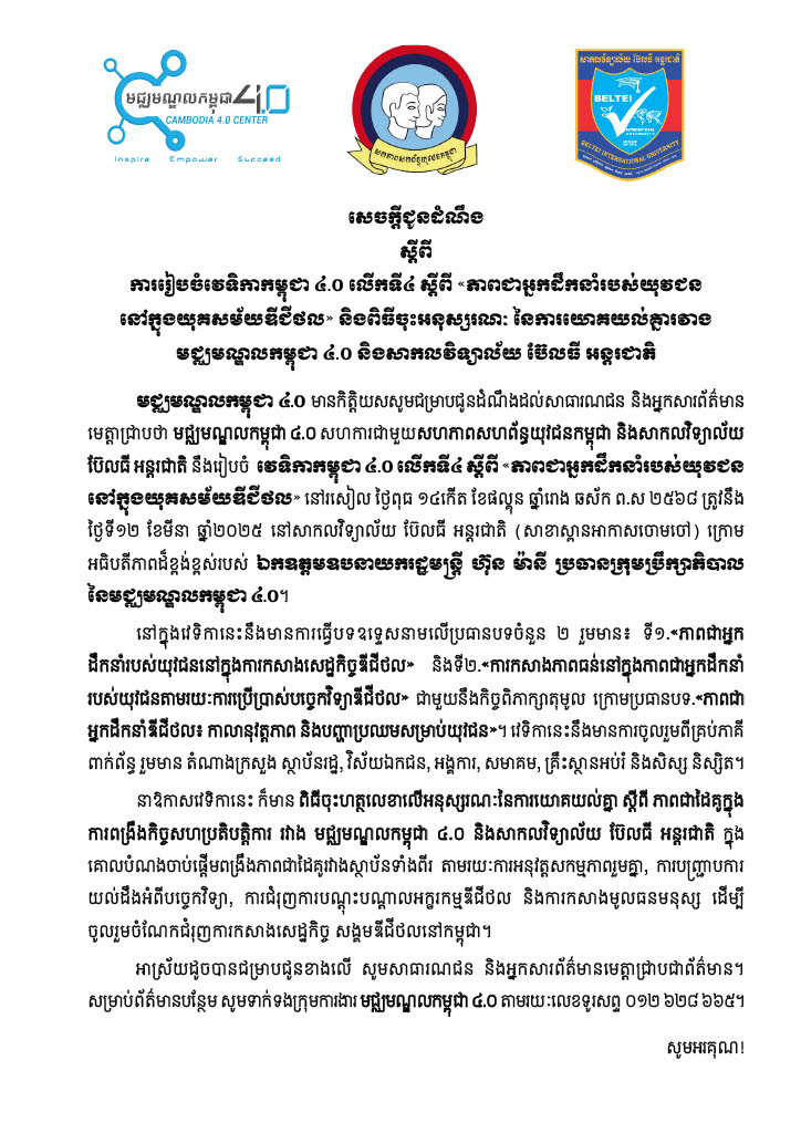 មជ្ឈមណ្ឌល​កម្ពុជា ៤.០ សហការជាមួយ​សហភាពសហព័ន្ធយុវជន​កម្ពុជា និង​សាកលវិទ្យាល័យ​ប៊ែលធី អន្តរជាតិ នឹង​រៀបចំ វេទិកា​កម្ពុជា ៤.០ លើកទី៤ ស្តីពី “ភាពជាអ្នកដឹកនាំ​របស់យុវជន​នៅក្នុង​យុគសម័យ​ឌីជីថល” នា​រសៀល​ថ្ងៃទី១២ ខែមីនា ឆ្នាំ​២០២៥ សប្តាហ៍​ក្រោយនេះ នៅ​សាកលវិទ្យាល័យ​ប៊ែលធី អន្តរជាតិ សាខាស្ពានអាកាសចោមចៅ ក្រោម​អធិបតីភាព​របស់ ឯកឧត្តមឧបនាយករដ្ឋមន្រ្តី ហ៊ុន ម៉ានី ប្រធាន​ក្រុមប្រឹក្សា​ភិបាល នៃមជ្ឈមណ្ឌល​កម្ពុជា ៤.០ និងជា​ប្រធាន​សហភាព​សហព័ន្ធ​យុវជន​កម្ពុជា។