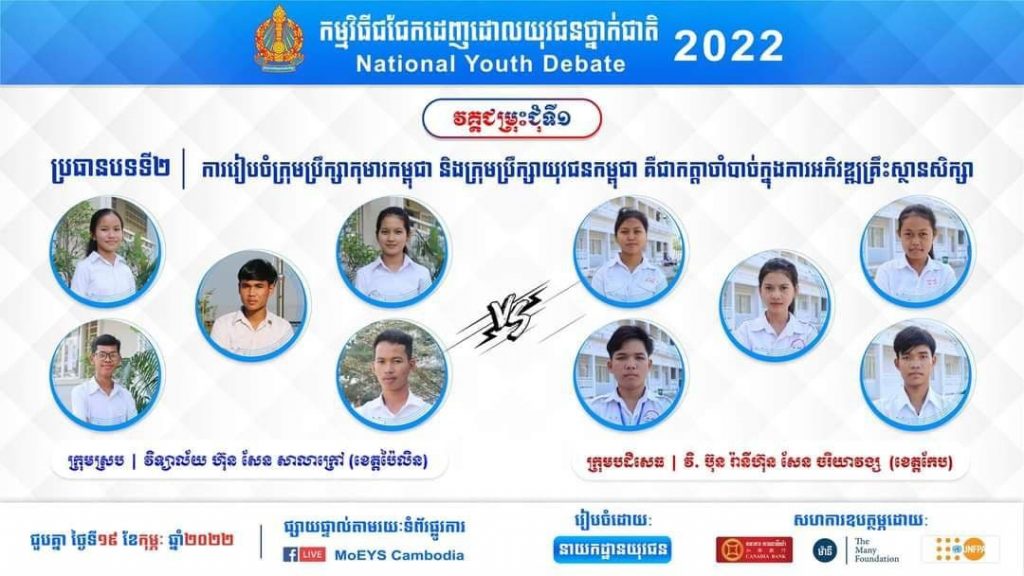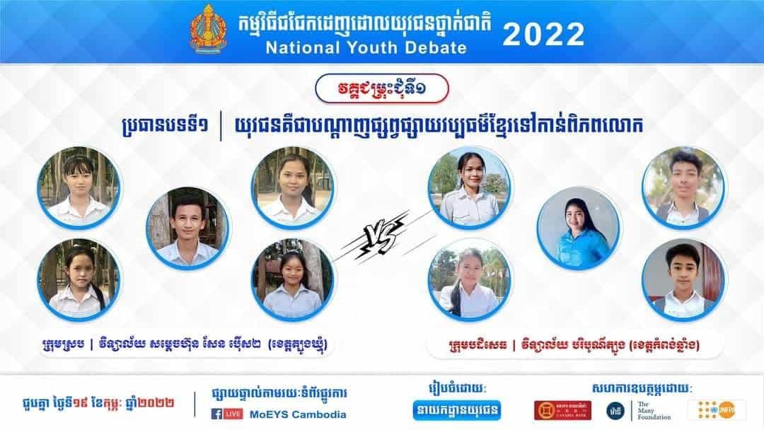 សូមជម្រាបជូនថា វគ្គជម្រុះជុំទី១ ក្នុងកម្មវិធី «ជជែកដេញដោយយុវជនថ្នាក់ជាតិ២០២២» នឹងប្រារព្ធនៅថ្ងៃទី១៩-២០ ខែកុម្ភៈ ឆ្នាំ២០២២ តាមរយៈប្រព័ន្ធអនឡាញ Zoom និងឡាយផ្ទាល់ក្នុងហ្វេសប៊ុកផេកផ្លូវការរបស់ក្រសួងអប់រំ យុវជន និងកីឡា ។ ក្នុងនោះ បេក្ខជនចំនួន ១៦វិទ្យាល័យផ្សេងគ្នា នឹងចូលមកប្រកួតលើវិញ្ញាសាចំនួន ៨វិញ្ញាសា ដោយមានក្រុមស្រម និងក្រុមបដិសេធ ៕