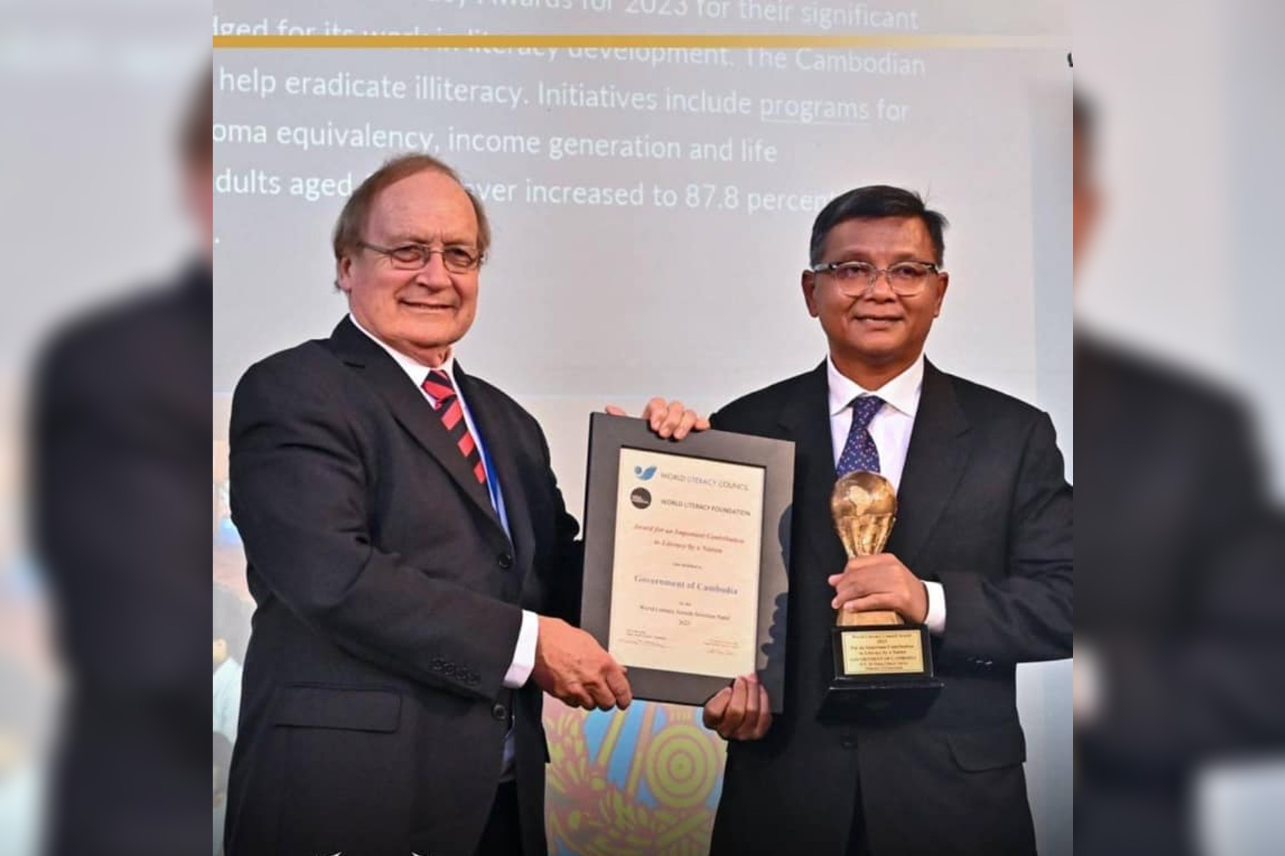 រដ្ឋមន្ត្រីក្រសួងអប់រំទទួលបានពានរង្វាន់ World Literacy Foundation Award ក្នុងនាមប្រទេសដែលមានភាពលេចធ្លោក្នុងការលើកកម្ពស់អក្ខរកម្ម និងការអប់រំ