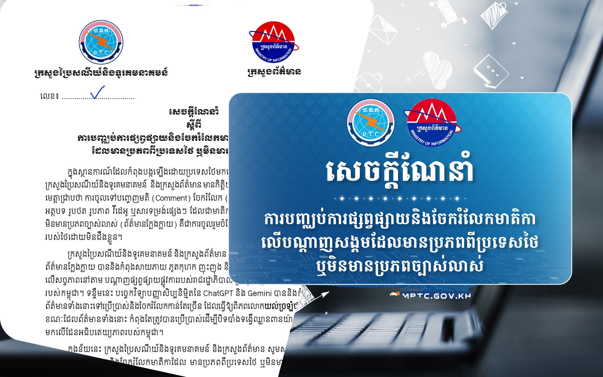 ក្នុងស្ថានការណ៍ដែលកំពុងបង្កឡើងដោយប្រទេសថៃមកលើអធិបតេយ្យភាព និងបូរណភាពកម្ពុជា ក្រសួងប្រៃសណីយ៍ និងទូរគមនាគម រួមជាមួយក្រសួងព័ត៌មាន នៅថ្ងៃនេះ (២៣ ធ្នូ) បានចេញសេចក្តីណែនាំមួយ ដោយស្នើដល់សាធារណជនខ្មែរទាំងអស់ សូមបញ្ឈប់ការចូលទៅបញ្ចេញមតិ (Comment) ចែករំលែក (Share) ឬចុចប្រតិកម្ម (React) នៅលើអត្ថបទ រូបថត រូបភាព វីដេអូ ឬសារទម្រង់ផ្សេងៗ ដែលជាមាតិកាតាមបណ្តាញសង្គមរបស់ប្រទេសថៃ ឬមិនមានប្រភពច្បាស់លាស់ (ព័ត៌មានក្លែងក្លាយ) ដោយថា វាគឺជាការចូលរួមចំណែកយ៉ាងសកម្មក្នុងការផ្សព្វផ្សាយមាតិការបស់ថៃដោយមិនដឹងខ្លួន។