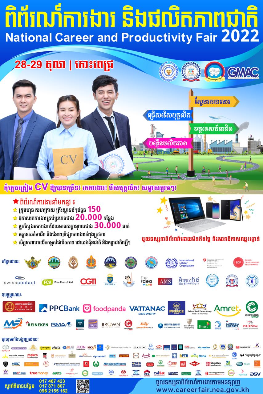 សូមបញ្ជាក់ដែរថា ពិព័រណ៍ការងារ និងផលិតភាពជាតិ ឆ្នាំ២០២២នេះ សហការរៀបចំដោយទីភ្នាក់ងារជាតិ មុខរបរ និងការងារ (NEA), សហភាពសហព័ន្ធយុវជនកម្ពុជារាជធានីភ្នំពេញ និង សមាគមរោងចក្រកាត់ដេរនៅកម្ពុជា (GMAC)។