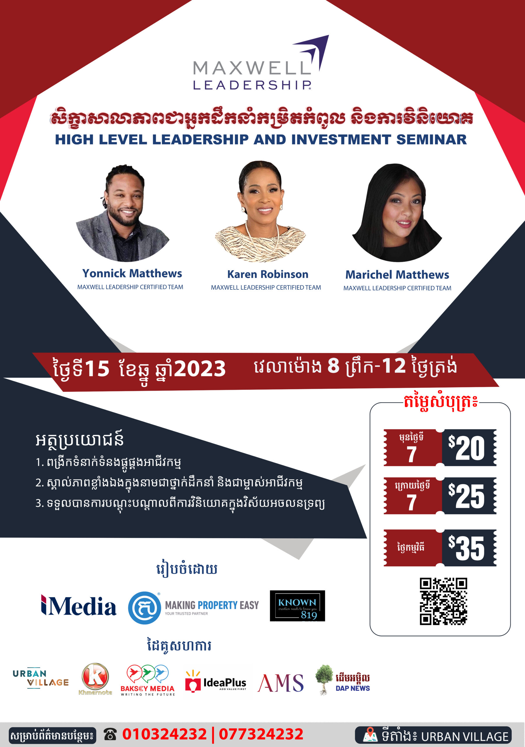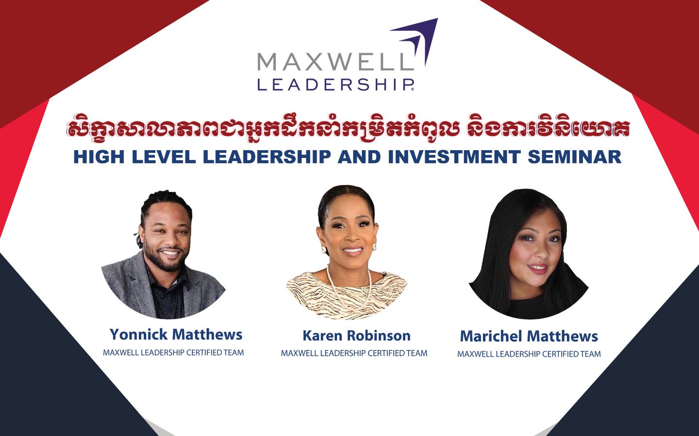 នៅថ្ងៃទី១៥ ខែធ្នូ ឆ្នាំ២០២៣ ខាងមុខនេះ MAXWELL LEADERSHIP ដែលជាកំពូលថ្នាក់ដឹកនាំបង្វឹកភាពជាអ្នកដឹកនាំលំដាក់ពិភពលោកដែលមកពីសហរដ្ឋអាមេរិចនឹងធ្វើការរៀបចំសិក្ខាសាលាស្តីពី «ភាពជាអ្នកដឹកនាំកម្រិតកំពូល និងការវិនិយោគ» មានការចូលរួមពីសំណាក់វាគ្មិនដែលសុទ្ធសឹងតែមានបទពិសោធន៍ជាច្រើនឆ្នាំក្នុងការបង្វឹកភាពជាអ្នកដឹកនាំទៅកាន់ ថ្នាក់ដឹកនាំ និងម្ចាស់អាជីវកម្មជុំវិញពិភពលោក ក៏ដូចជាការវិនិយោគពាន់លាន ក្នុងនោះវាគ្មិនរួមមាន៖ លោកស្រី Karen Robinson លោក Yonnick Matthews និងលោកស្រី Marichel Matthews។