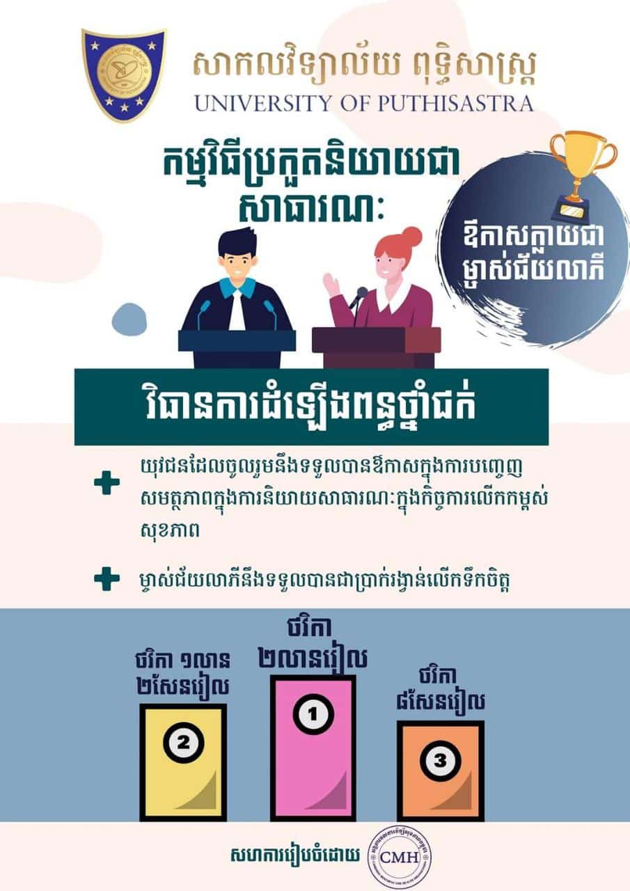 ទន្ទឹមគ្នានេះ យុវជនដែលចូលរួមនឹងទទួលបានឱកាសបញ្ចេញសមត្ថភាពក្នុងការនិយាយសាធារណៈ ក្នុងកិច្ចការលើកកម្ពស់សុខភាព ទួលបានប្រាក់រង្វាន់ មេដាយ និងលិខិតសរសើរពីសាកលវិទ្យាល័យពុទ្ធិសាស្ត្រ និងអង្គការ CMH ។ ក្នុងនោះម្ចាស់ជ័លាភីលេខ១ ទទួលបានថវិកា ២លានរៀល ជ័លាភីលេខ ២ ទទួលបានថវិកា ១លានពីរសែនរៀល និងជ័យលាភីលេខ៣ ទទួលបានថវិកា ៨សែនរៀល។