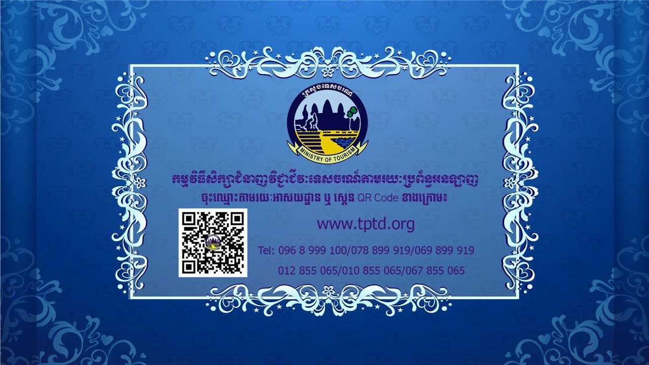 គួរជម្រាបជូនថា មន្ត្រីរាជការ យុវជន សិស្ស និស្សិត និងសាធារណជន អាចចូលរួមចុះឈ្មោះសិក្សាក្នុងវគ្គបណ្តុះបណ្តាលនេះតាមរយៈតំណភ្ជាប់ https://www.tptd.org ឬ តាមរយៈស្តេន QR Code ។ ចំពោះព័ត៌មានបន្ថែមផ្សេងៗទៀត សូមធ្វើការទាក់ទងដោយផ្ទាល់ទៅនាយកដ្ឋានបណ្តុះបណ្តាលជំនាញវិជ្ជាជីវៈទេសចរណ៍នៃក្រសួងទេសចរណ៍ ឬតាមរយៈលេខទូរស័ព្ទ ០៨៩ ៥៥៦ ៦២៥ ឬ ០៧៨ ៨៩៩ ៩១៩ រៀងរាល់ម៉ោងធ្វើការ ៕