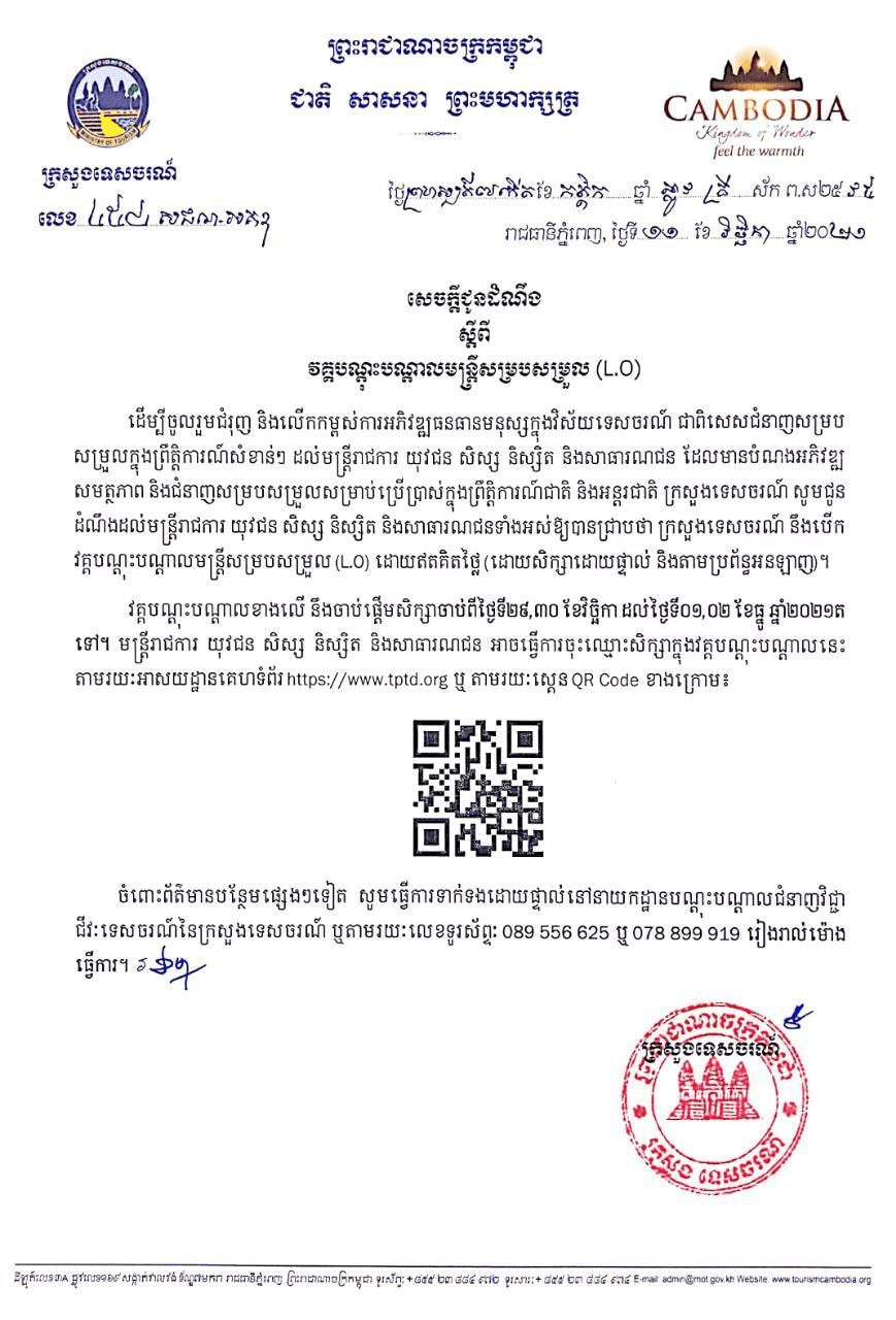 ភ្នំពេញ – ក្រសួងទេសចរណ៍កាលពីថ្ងៃទី ១១ ខែវិច្ឆិកា ឆ្នាំ២០២១ កន្លងទៅ បានជូនដំណឹង ស្ដីពីវគ្គបណ្ដុះបណ្ដាលមន្រ្តីសម្របសម្រួល (L.O) ដល់មន្ត្រីរាជការ យុវជន សិស្ស និស្សិត និងសាធារណជនដោយឥតគិតថ្លៃ ដោយការសិក្សានេះធ្វើឡើងដោយផ្ទាល់ និងតាមប្រព័ន្ធអនឡាញ ។