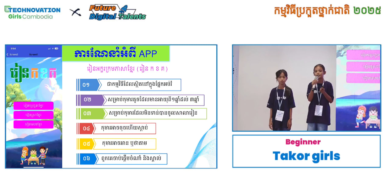 កុមារីអាយុ១២ឆ្នាំមួយក្រុម មកពីខេត្តព្រៃវែង ហៅឈ្មោះក្រុមខ្លួនឯងថា Takor Girls បានបង្កើតអេបទូរស័ព្ទដៃ “រៀនអក្ខរក្រមភាសាខ្មែរ” ដើម្បីជួយកុមារពីអាយុ១ឆ្នាំ ដល់៣ឆ្នាំឱ្យចេះអានអក្សរមុនពេលចូលរៀន បានជាប់ជ័យលាភីសហគ្រិនវ័យក្មេងថ្នាក់ជាតិកម្រិតបឋមសិក្សា ក្នុងកម្មវិធីប្រកួតប្រជែងថ្នាក់ជាតិ “តិចណូវេសិន និងអនាគតទេពកោសល្យឌីជីថល ឆ្នាំ២០២៥”។