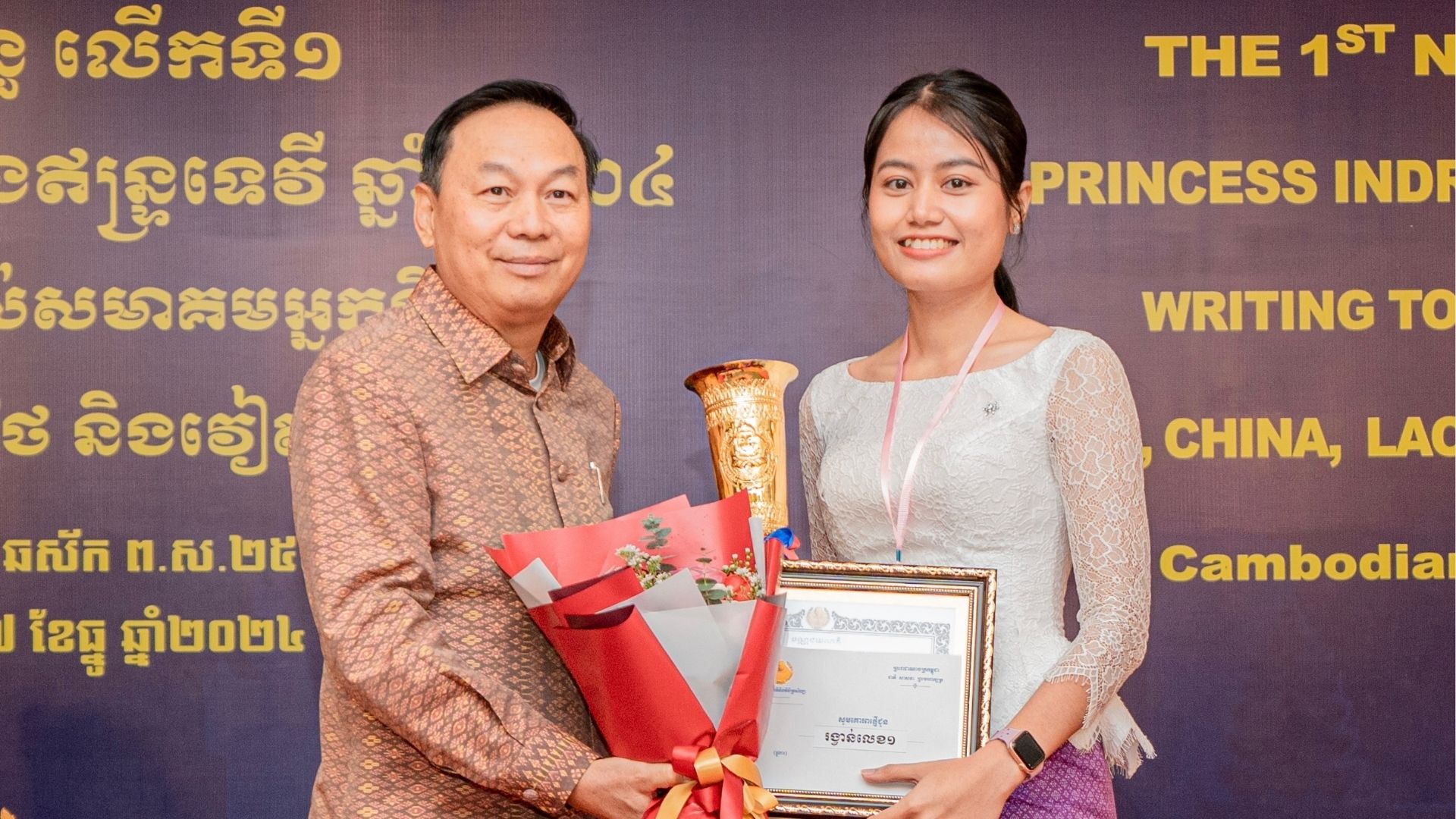 ស្នាដៃប្រលោមលោកខ្លីចំណងជើង “ដើមពុទ្រាឧត្តមា” របស់អ្នកស្រី គង់ ច័ន្ទវ៉ាន់ណេង ដែលសាច់រឿងបានបង្ហាញពីតម្លៃអប់រំ និងលើកទឹកចិត្តស្ត្រីឱ្យស្រឡាញ់ការសិក្សា តស៊ូព្យាយាមជំនះឧបសគ្គដោយមិនបោះបង់ការអប់រំ បានជាប់ជ័យលាភីលេខ១ ក្នុងការប្រកួតពានរង្វាន់ព្រះនាងឥន្រ្ទទេវី ក្នុងឆ្នាំ២០២៤នេះ។