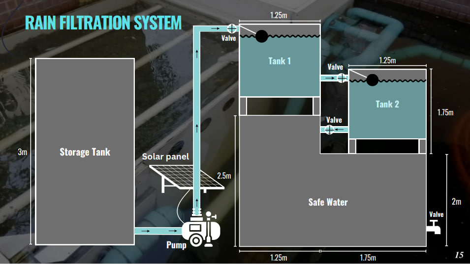 និស្សិតបញ្ចប់ការសិក្សាផ្នែកវិស្វកម្មគីមី រូបនេះ បញ្ជាក់ថា ប្រព័ន្ធចម្រោះទឹកភ្លៀង (Rain Filtration System) ត្រូវបានបែងចែកជា២ធំ គឺទី១. ខ្សាច់ជីវសាស្រ្ត ប្រើប្រាស់៣ស្រទាប់ផ្សេងគ្នា ក្នុងនោះ ស្រទាប់ទី១ ខ្សាច់ម៉ត់ ស្រទាប់ទី១ ខ្សាច់ ស្រទាប់ទី៣ ថ្ម។ ក្នុងធុងទី១នេះ មានគោលបំណងដកយកប្រភេទបាក់តេរី ក៏ដូចជាសារធាតុកខ្វក់នៅក្នុងទឹក។ ចំពោះធុងទី២ សម្រាប់ដកយកក្លិន ធ្វើឱ្យទឹកកាន់តែមានរស់ជាតិ និងដកយកពពួកសារធាតុកខ្វក់នៅក្នុងទឹក។ ធុងទី២ នេះប្រើ៤ស្រទាប់ រួមមាន ១. ថ្ម ២.ធ្យូង ៣. ខ្សាច់ និង៤. ថ្ម។