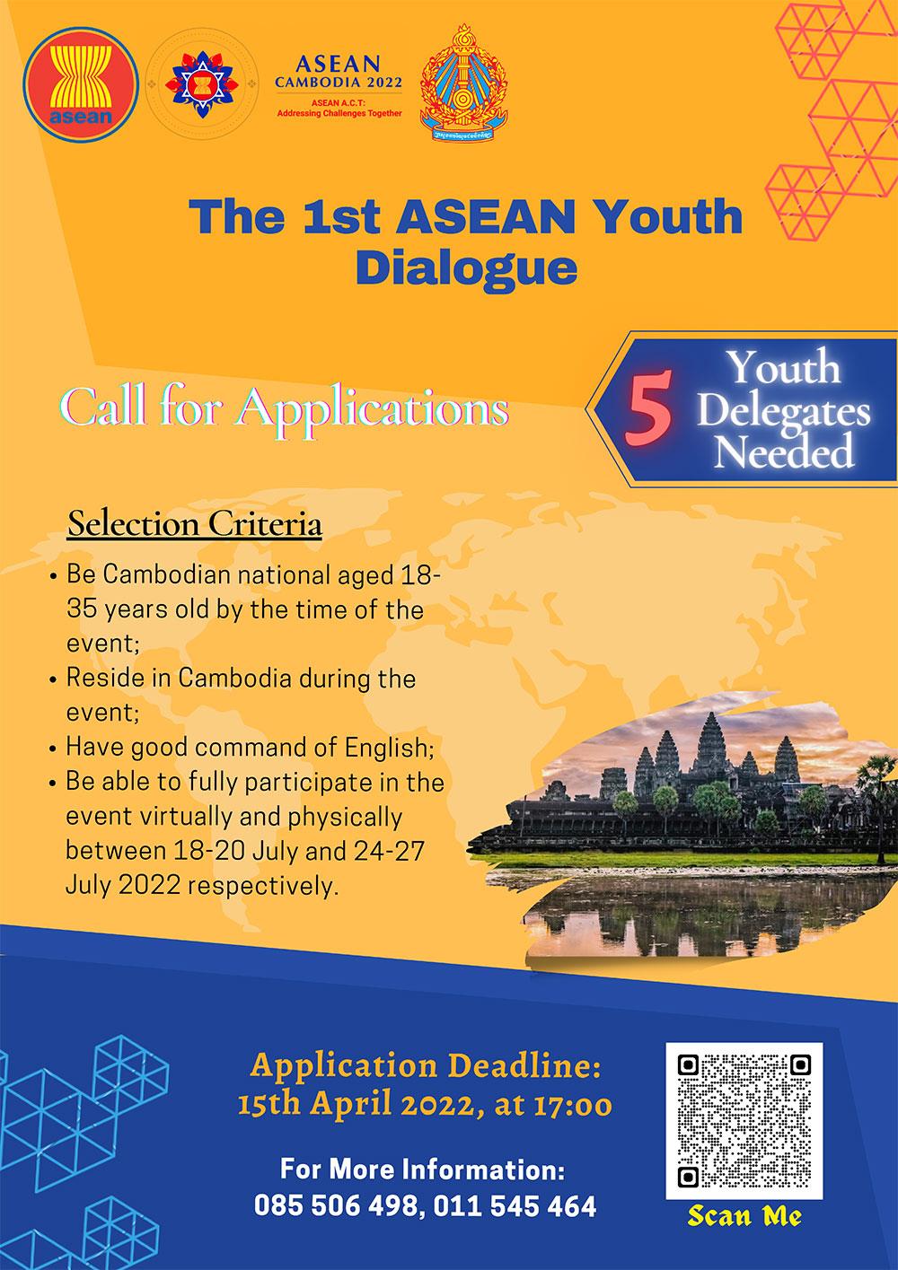 យុវជនកម្ពុជាចំនួន៥រូប នឹងត្រូវជ្រើសរើសជាតំណាងយុវជនកម្ពុជា ចូលរួមក្នុងកិច្ចសន្ទនាយុវជនអាស៊ានលើកទី១នេះ ។ យុវជនកម្ពុជាដែលមានអាយុចន្លោះពី១៨ ដល់ ៣៥ឆ្នាំ មានសមត្ថភាព និងបំណងចង់យល់ដឹង ចង់រៀនសូត្រ ចង់ធ្វើការពិភាក្សាអំពីអាស៊ាន ចង់បង្ហាញសមត្ថភាព និងទេពកោសល្យរបស់ខ្លួននៅលើឆាកអន្តរជាតិ ត្រូវបានលើកទឹកចិត្តសម្រាប់ការដាក់ពាក្យចូលរួមដោយចាប់ផ្តើមពីថ្ងៃនេះ រហូតដល់ថ្ងៃទី១៥ ខែមេសា ឆ្នាំ២០២២ តាមរយៈតំណភ្ជាប់នេះ https://forms.gle/ZVA2cphvA6xNFzEy9 ។