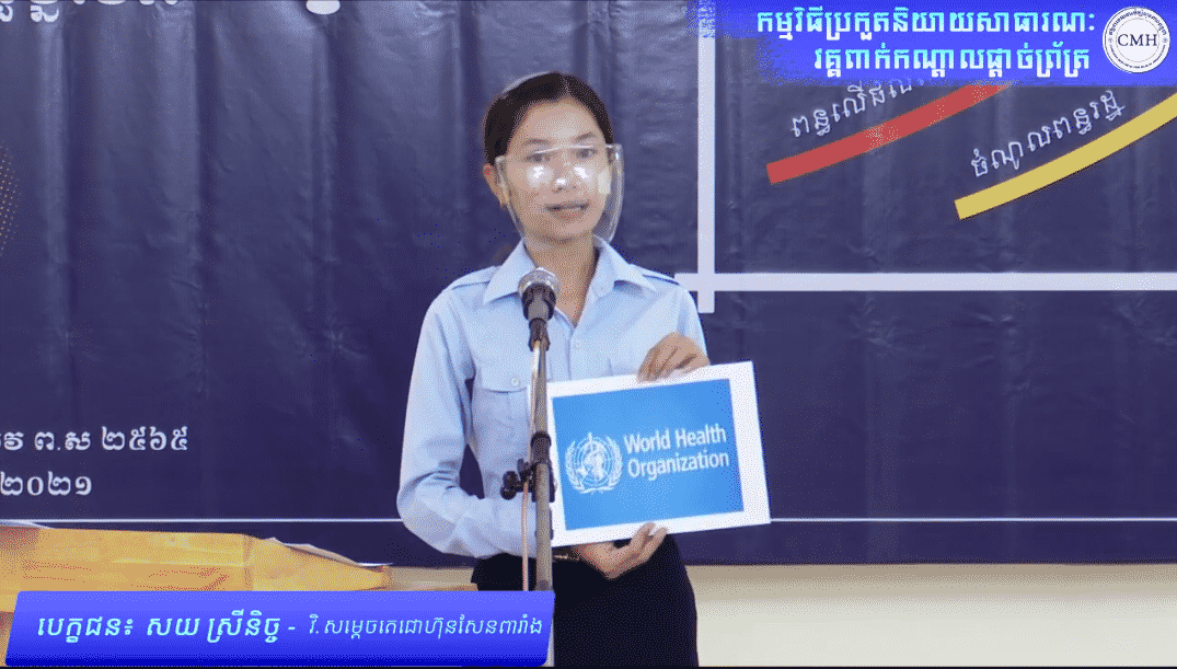 ភ្នំពេញ – យុវតី សយ ស្រីនិច្ច ជាសិស្សមកពីវិទ្យាល័យហ៊ុនសែនពារាំង នៃខេត្តព្រៃវែង ត្រូវបានគណៈកម្មការប្រកាសឱ្យជាប់ជ័យលាភីលេខ១ ក្នុងវគ្គផ្ដាច់ព្រ័ត្រ នៃកម្មវិធីប្រកួតនិយាយសាធារណៈលើប្រធានបទ “ហេតុអ្វីបានជាកម្ពុជាចាំបាច់ត្រូវដំឡើងពន្ធថ្នាំជក់” និងបង្ហាញអំពីសារៈសំខាន់ “វិធានការពន្ធថ្នាំជក់ និងជំងឺកូវីដ១៩” ដែលប្រព្រឹត្តទៅកាលពីពាក់កណ្តាលខែវិច្ឆិកាកន្លងទៅ។