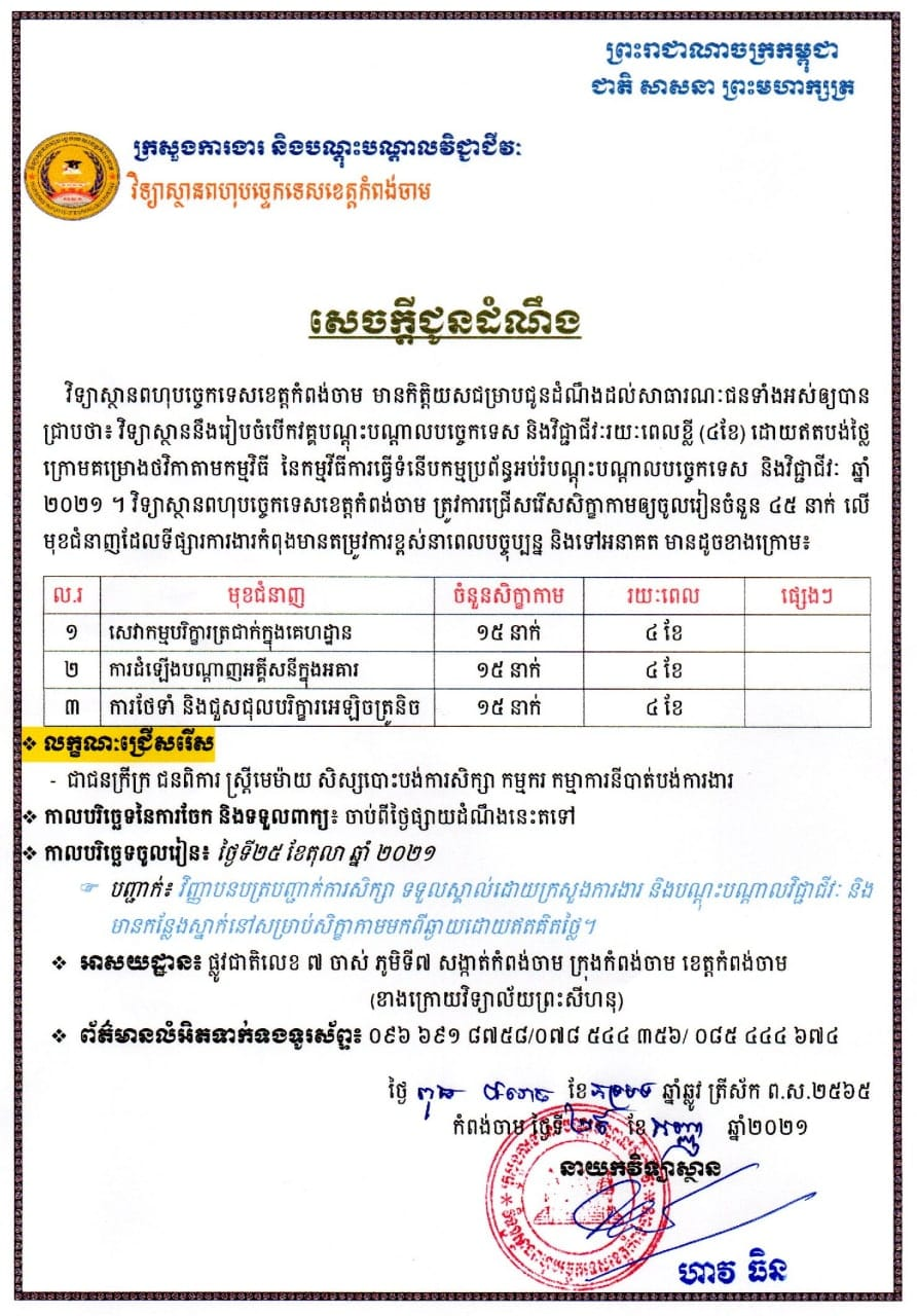 ឱកាសសិក្សាជំនាញវិជ្ជាជីវៈចំនួន៤០កន្លែងនៅវិទ្យាស្ថានពហុបច្ចេកទេសខេត្តបន្ទាយមានជ័យ