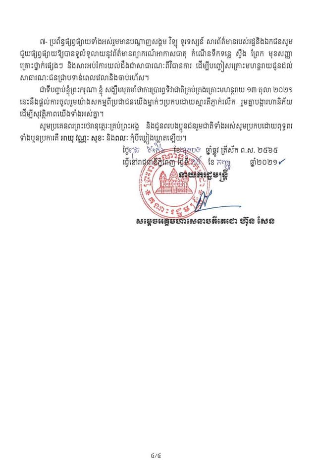 ៧- ប្រព័ន្ធផ្សព្វផ្សាយទាំងអស់រួមមានបណ្តាញសង្គម វិទ្យុ ទូរទស្សន៍ សារព័ត៌មានរបស់រដ្ឋនិងឯកជនសូមជួយផ្សព្វផ្សាយឱ្យបានទូលំទូលាយនូវព័ត៌មានព្យាករណ៍អាកាសធាតុ កំណើនទឹកទន្លេ ស្ទឹង ព្រែក មុខសញ្ញាគ្រោះថ្នាក់ផ្សេងៗ និងសារអប់ការយល់ដឹងជាសាធារណៈពីវិធានការ ដើម្បីបញ្ចៀសគ្រោះមហន្តរាយជូនដល់សាធារណៈជនជ្រាបទាន់ពេលវេលានិងឆាប់រហ័ស ។ គួរបញ្ជាក់ដែរថា ឆ្នាំនេះ គឺជាឆ្នាំទី២ នៃការប្រារព្ធទិវាជាតិគ្រប់គ្រងគ្រោះមហន្តរាយ ប៉ុន្តែអាស្រ័យដោយស្ថានភាព នៃជំងឺកូវីដ១៩ មិនទាន់ស្រាកស្រាន្ត ជាហេតុមិនអាចឲ្យមានការជួបជុំមហាជនប្រារព្ធមីទ្ទិង និងធ្វើយុទ្ធនាការអប់រំអំពីការកាត់បន្ថយហានិភ័យគ្រោះមហន្តរាយនោះបាន៕