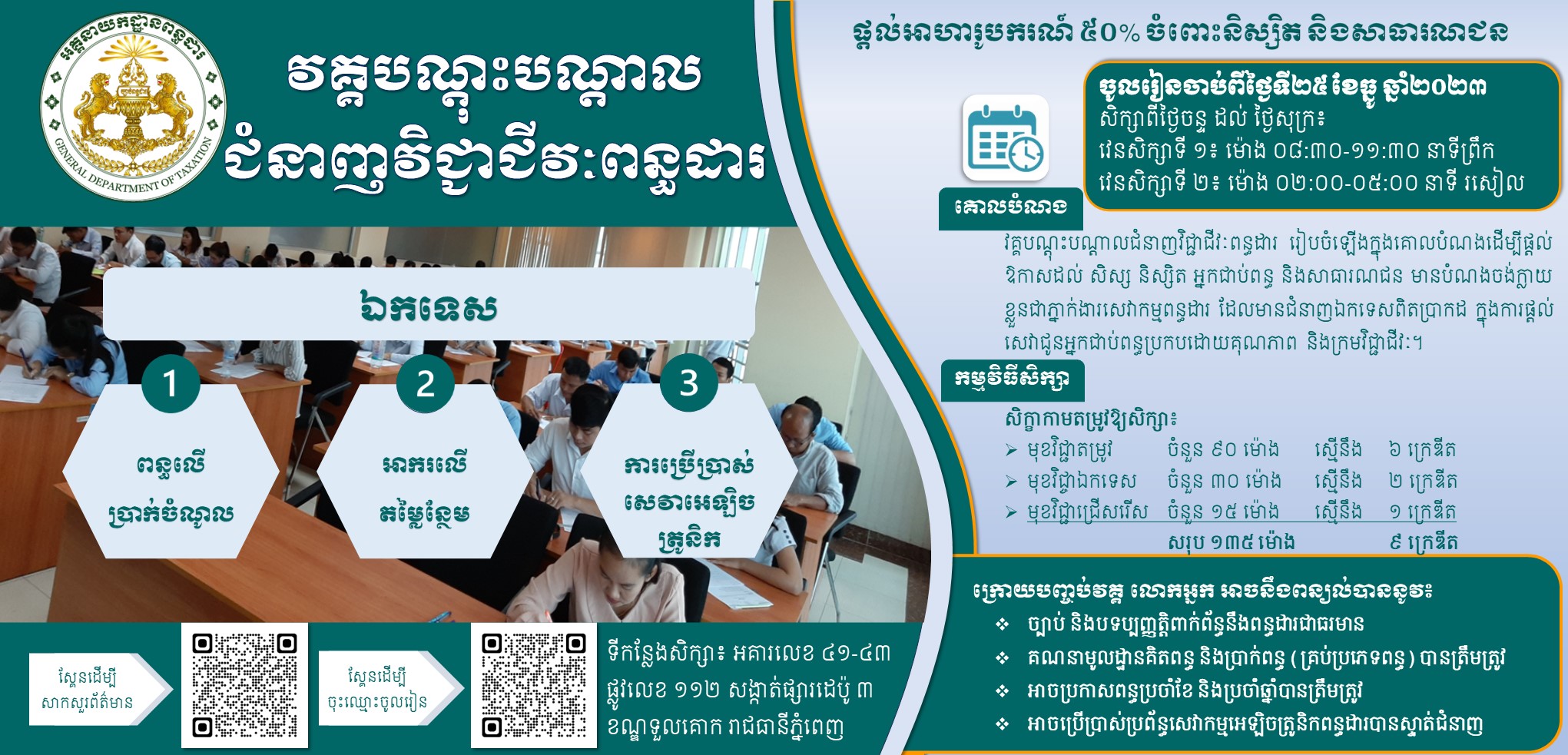 ការសិក្សានឹងធ្វើឡើងនៅអគារសាលាជាតិពន្ធដារដែលមានអាសយដ្ឋាន អគារលេខ៤១-៤៣ ផ្លូវលេខ១១២ សង្កាត់ផ្សារដេប៉ូ៣ ខណ្ឌទួលគោក រាជធានីភ្នំពេញ(ខាងកើតអគ្គនាយកដ្ឋានពន្ធដារ) ឬទំនាក់ទំនង Hotline ១២៧៧។