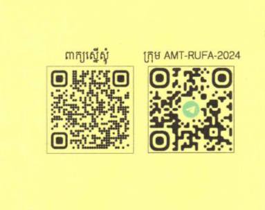 សម្រាប់ព័ត៌មានបន្ថែមទាក់ទងនឹងព័ត៌មានសិក្សាអាចទាក់ទងទៅកាន់គ្រឹះស្ថានសាកលវិទ្យាល័យដោយផ្ទាល់ដែលមានទីតាំងនៅ អគារ “ខ” មហាវិថីវិចិត្រសិល្បៈ ភូមិព្រែកលៀប សង្កាត់ព្រែកលៀប ខណ្ឌជ្រោយចង្វារ រាជធានីភ្នំពេញ។ សម្រាប់ព័ត៌មានបន្ថែមទាក់ទងនឹងអាហារូបករណ៍ អាចទំនាក់ទំនងទៅកាន់ការិយាល័យអាហារូបករណ៍ នៅផ្ទះលេខ៤ ផ្លូវ៥២២ សង្កាត់បឹងកក់១ ខណ្ឌទួលគោក រាជធានីភ្នំពេញ នៅរៀងរាល់ថ្ងៃចន្ទ-សុក្រ វេលាម៉ោង ៨ព្រឹក-៥ល្ងាច ឬស្កេនចូលតេលេក្រាម (AMT-RUFA-2024) តាមរយៈ QR Code ខាងក្រោម។