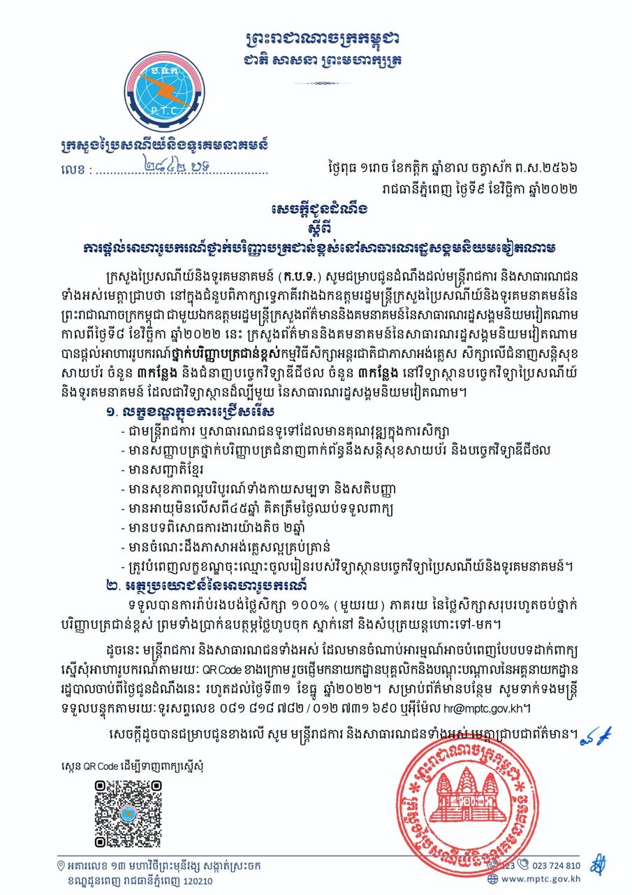 សម្រាប់ព័ត៌មានបន្ថែមអាចធ្វើការទំនាក់ទំនងទៅកាន់មន្ត្រីទទួលបន្ទុកតាមរយៈលេខទូរស័ព្ទ ០៨១ ៨១៨ ៧៨២ និង ០១២ ៧៣១ ៦៩០ ឬអ៊ីម៉ែល hr@mptc.gov.kh ៕