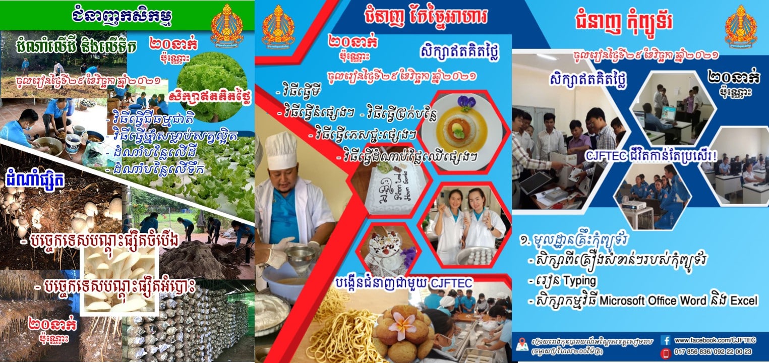 ភ្នំពេញ – ជាឱកាសដ៏ល្អមួយសម្រាប់អ្នកដែលចង់ចេះជំនាញបច្ចេកទេសកសិកម្ម កុំព្យូទ័រ និងសេវាម្ហូបអាហារ ពេលនេះក្រសួងអប់រំ យុវជន និងកីឡា បានប្រកាសជ្រើសរើសសិស្សចំនួន ១០០នាក់ឱ្យចូលរៀនដោយឥតបង់ថ្លៃនៅមជ្ឈមណ្ឌលអប់រំបច្ចេកទេសមិត្តភាពកម្ពុជា-ជប៉ុន ដែលមានទីតាំងស្ថិតនៅក្នុងបរិវេណសាលាគរុកោសល្យ និងវិក្រឹតការខេត្តសៀមរាប។