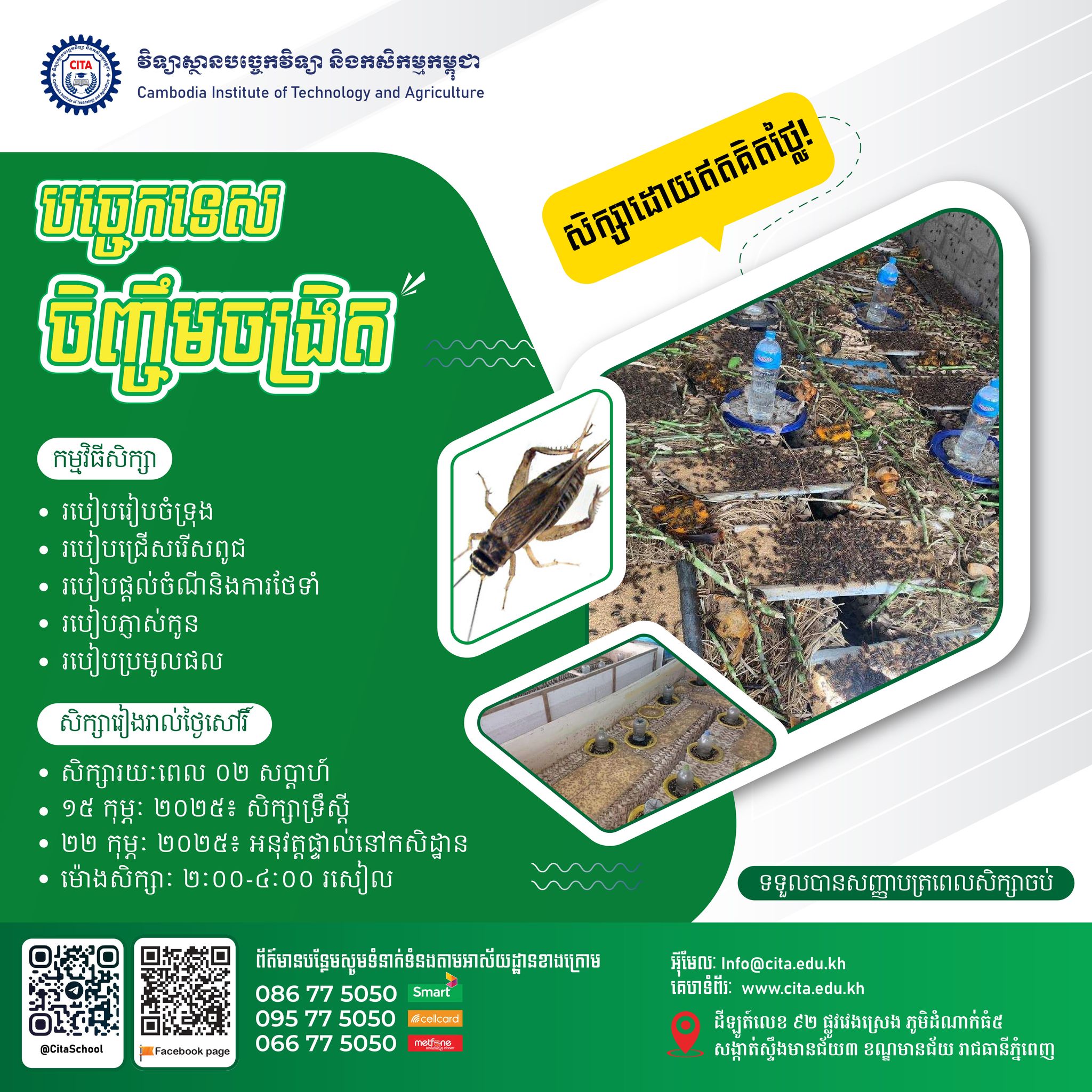 វិទ្យាស្ថានបច្ចេកវិទ្យា និងកសិកម្មកម្ពុជា (CITA) កំពុងផ្ដល់ឱកាសដល់សាធារណជន សម្រាប់ការរៀនជំនាញបច្ចេកទេសចិញ្ចឹមចង្រិត ដោយឥតគិតថ្លៃ។ ការសិក្សាមានរយៈពេល២សប្ដាហ៍ និងទទួលបានជំនាញច្បាស់លាស់សម្រាប់ខ្លួនឯង។