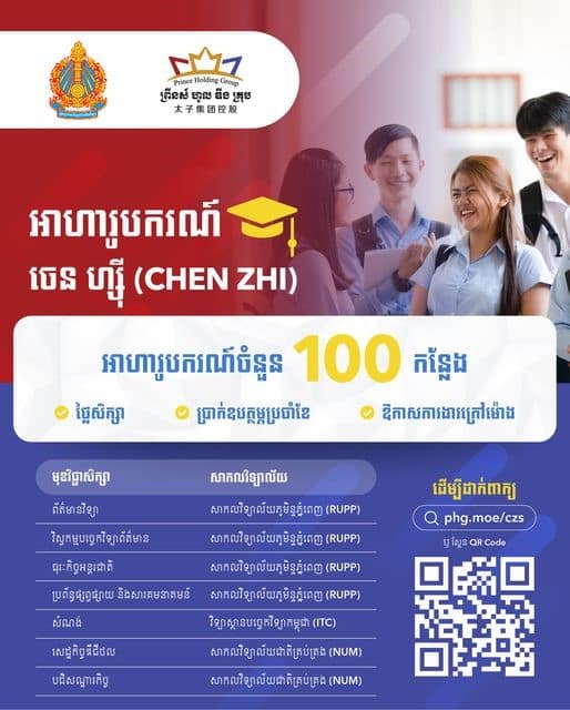 ភ្នំពេញ- អាហារូបករណ៍ចេនហ្ស៊ី និងមូលនិធិសប្បុរសធម៌ព្រីនស៍ ដោយមានការសហការជាមួយក្រសួងអប់រំ យុវជន និងកីឡា បានប្រកាសផ្ដល់អាហារូបករណ៍ដល់សិស្សវិទ្យាល័យថ្នាក់ទី១២ ដែលចង់បន្តការសិក្សានៅថ្នាក់ឧត្ដមសិក្សានាពេលខាងមុខនេះចំនួន១០០កន្លែង ។