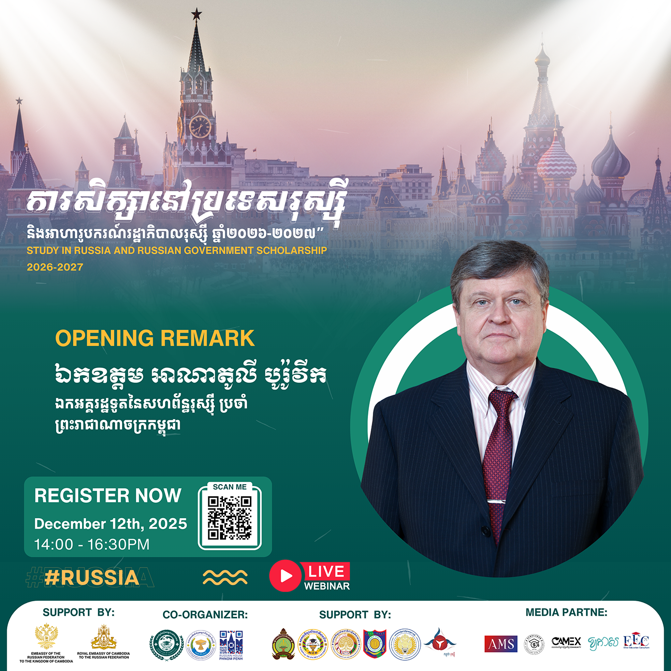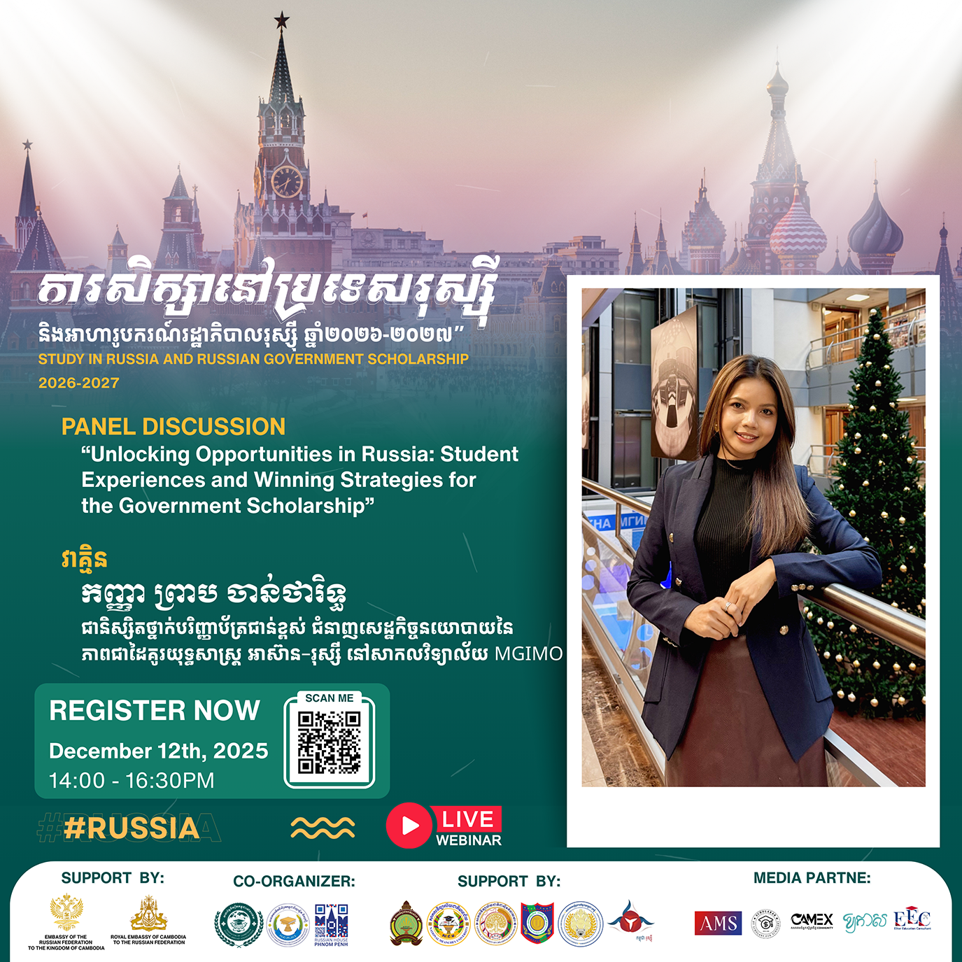 ឱកាសអាហារូបករណ៍រដ្ឋាភិបាលរុស្ស៊ី ឆ្នាំ២០២៦-២០២៧ ៖ សិក្ខាសាលាអនឡាញ “Study In Russia” សម្រាប់និស្សិតកម្ពុជា!