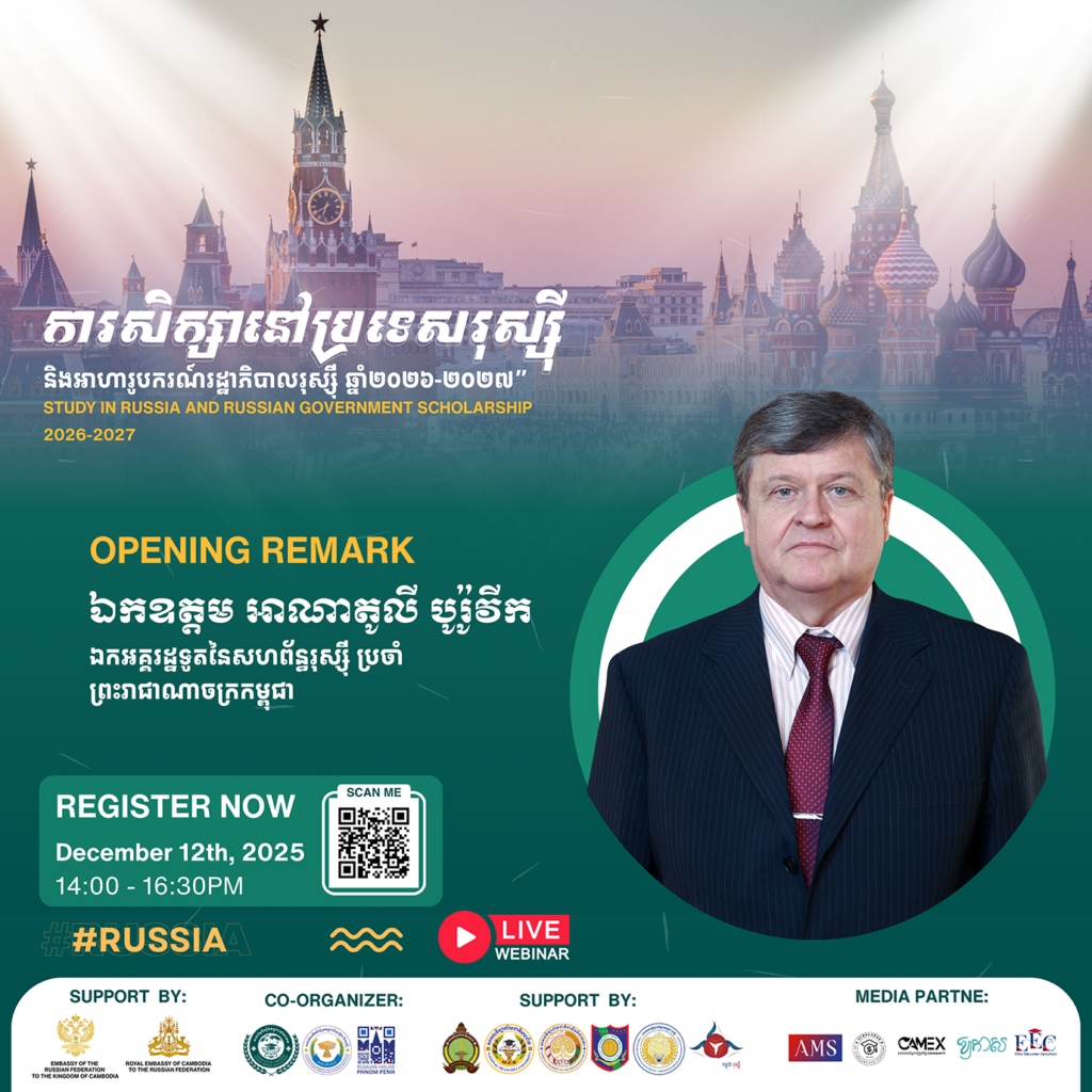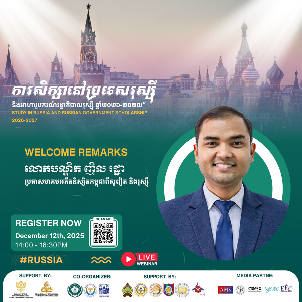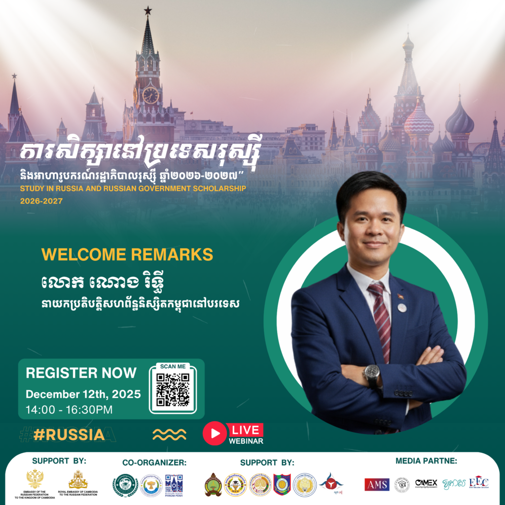 សមាគមអតីតនិស្សិតកម្ពុជាពីសហភាពសូវៀត និងរុស្ស៊ី សហការជាមួយ សព័ន្ធនិស្សិតកម្ពុជា នៅបរទេស (Camstudent) និង មជ្ឈមណ្ឌលវិទ្យាសាស្ត្រ និងវប្បធម៌រុស្ស៊ី នៅភ្នំពេញ ដោយទទួលបានការគាំទ្រពី ស្ថានឯកអគ្គរដ្ឋទូតសហព័ន្ធរុស្ស៊ីប្រចាំកម្ពុជា, ស្ថានឯកអគ្គរដ្ឋទូតកម្ពុជា ប្រចាំសហព័ន្ធរុស្ស៊ី, និងសាកលវិទ្យាល័យមួយចំនួននៅកម្ពុជា នឹងរៀបចំសិក្ខាសាលាអនឡាញស្តីពី “Study In Russia: Russian Government Scholarship 2026–2027” ដែល​នឹងប្រព្រឹត្តទៅនៅថ្ងៃសុក្រ ទី១២ ខែធ្នូ ឆ្នាំ២០២៥ ពេលម៉ោង ១:៥០ រសៀល ដល់ ៤:៣០ ល្ងាច (ម៉ោងនៅរាជធានីភ្នំពេញ)។