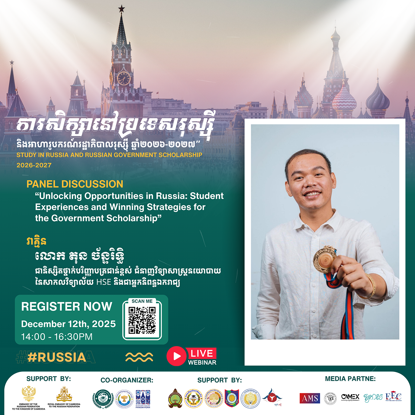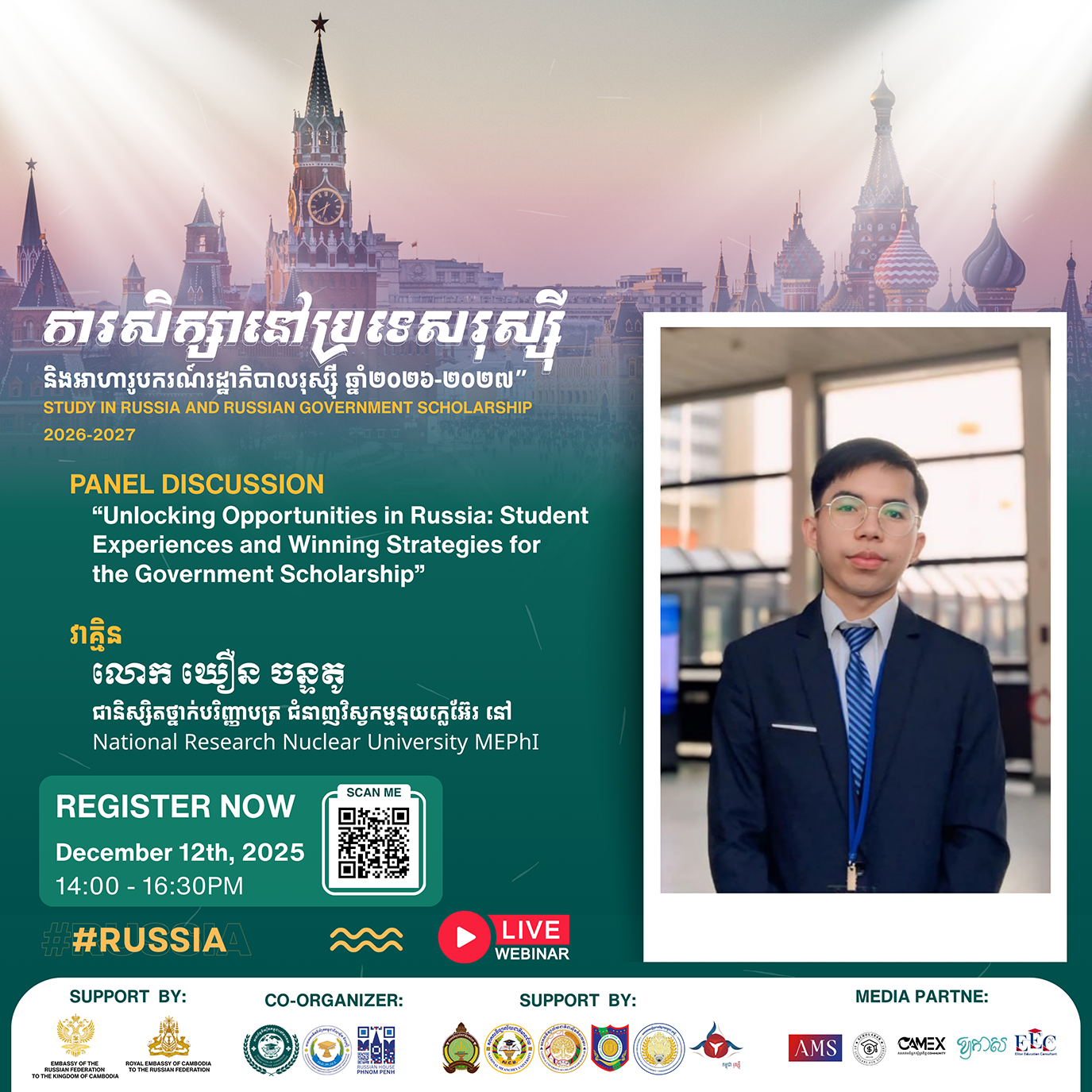 ដំណើរការដាក់ពាក្យសុំអាហារូបករណ៍រដ្ឋាភិបាលរុស្ស៊ី គឺសាមញ្ញ ពិតមែនតែពោលពេញទៅដោយការប្រកួតប្រជែងខ្លាំង។ ព័ត៌មានអំពីប្រព័ន្ធអប់រំរុស្ស៊ី និងចំនួនកន្លែងទទួលសម្រាប់ឆ្នាំសិក្សា ២០២៦–២០២៧ នឹងត្រូវលើកឡើងនៅក្នុងសិក្ខាសាលានេះ។ ព័ត៌មាននេះនឹងត្រូវបង្ហាញដោយ៖ លោក សុខ ច័ន្ទឡុងហ្វុង, និស្សិតថ្នាក់បណ្ឌិតនៅសាកលវិទ្យាល័យ Peoples’Friendship University of Russia។