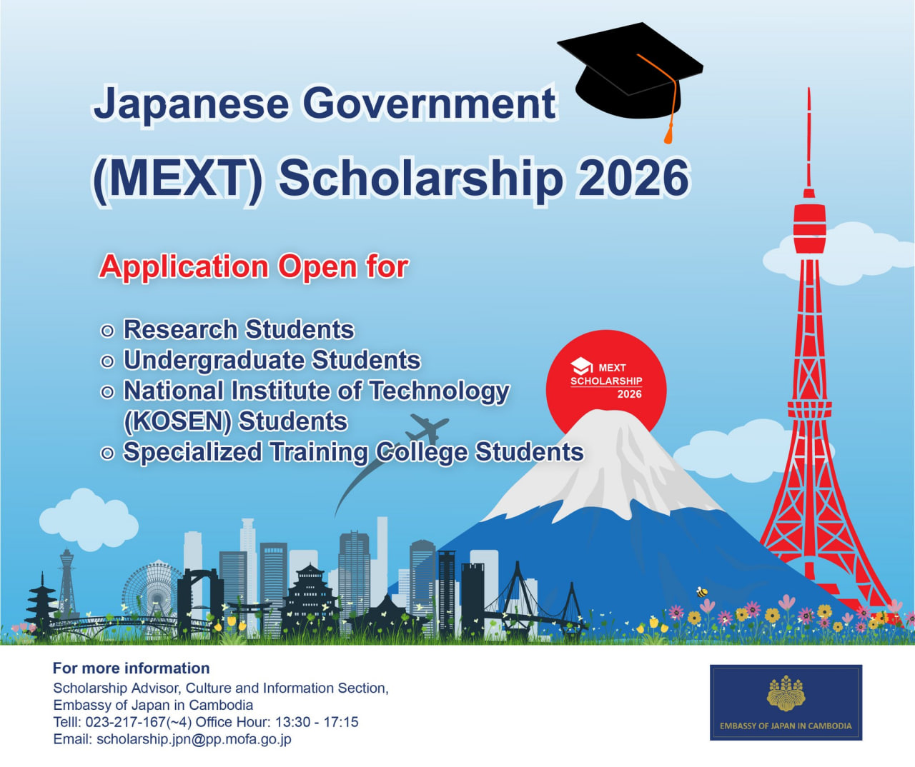 តាមរយៈស្ថានទូតជប៉ុនប្រចាំកម្ពុជា កម្មវិធីអាហារូបករណ៍រដ្ឋាភិបាលជប៉ុន MEXT ( Japanese Government Scholarship 2026) ប្រកាសផ្ដល់អាហារូបករណ៍ដល់និស្សិត​កម្ពុជា​សម្រាប់​ការ​សិក្សា​ថ្នាក់ឧត្ដមចំនួន៤កម្រិត​ នៅឆ្នាំសិក្សា២០២៦។