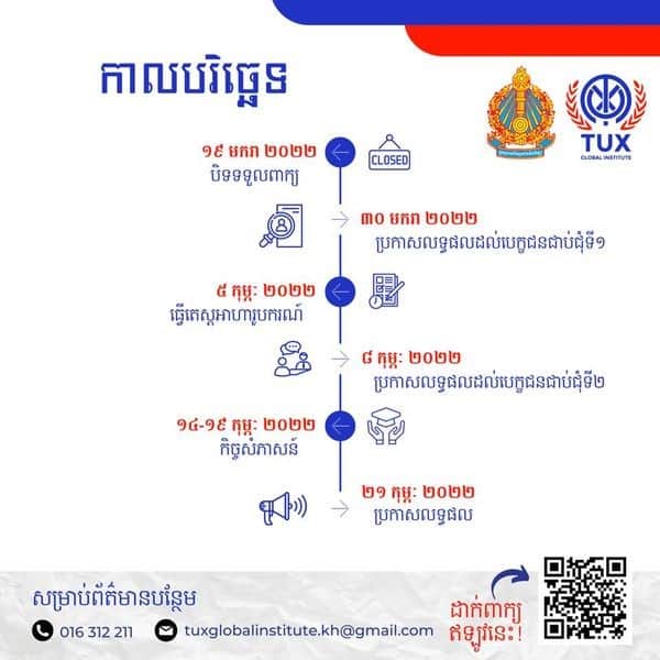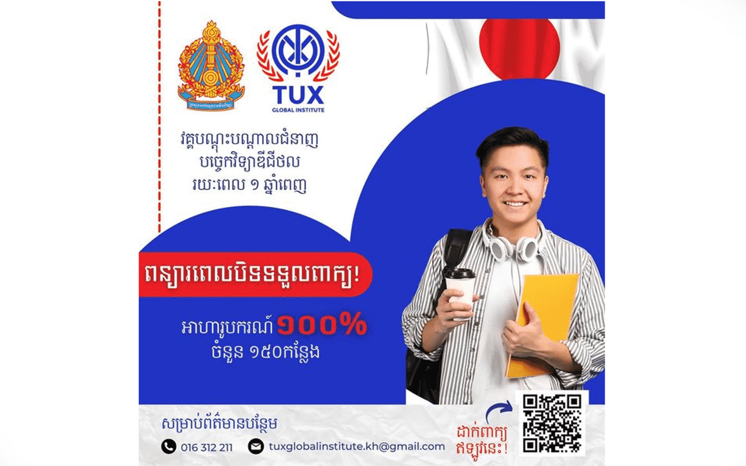 សម្រាប់ព័ត៌មានបន្ថែម ០១៦ ៣១២ ២១១ និងតាមរយៈ Email: tuxglobalinstitute.kh@gmail.com ។