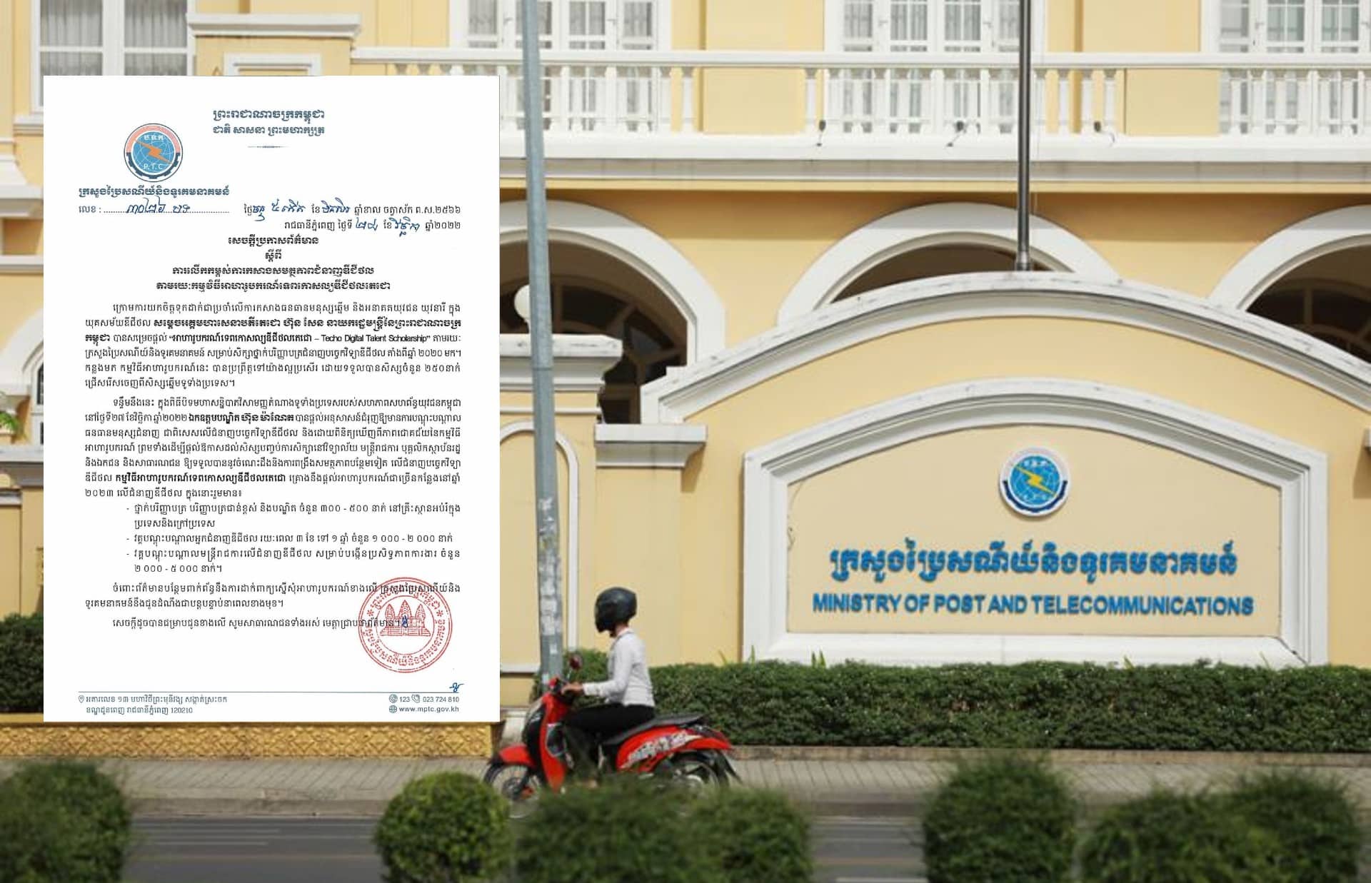 ភ្នំពេញ- ក្រសួងប្រៃសណីយ៍ និងទូរគមនាគមន៍ បានប្រកាសថា ដោយយោងទៅលើអនុសាសន៍របស់ ឯកឧត្តមបណ្ឌិត ហ៊ុន ម៉ាណែត ក្នុងពិធីបិទមហាសន្និបាតវិសាមញ្ញតំណាងទូទាំងប្រទេស របស់សហភាពសហព័ន្ធយុវជនកម្ពុជា ក្នុងការជំរុញឱ្យមានការបណ្តុះបណ្តាលធនធានមនុស្សជំនាញ ជាពិសេសលើជំនាញបច្ចេកវិទ្យាឌីជីថល និងជាការផ្តល់ឱកាសដល់សិស្សបញ្ចប់ការសិក្សានៅវិទ្យាល័យ ក៏ដូចជាមន្រ្តីរាជការ បុគ្គលិកស្ថាប័នរដ្ឋ ឯកជន និងសាធារណជន កម្មវិធីអាហារូបករណ៍ទេពកោសល្យឌីជីថលតេជោ-Techo Digital Talent Scholarship នឹងផ្តល់អាហារូបករណ៍ជាច្រើនកន្លែងនៅឆ្នាំសិក្សា២០២៣ លើជំនាញឌីជីថល។